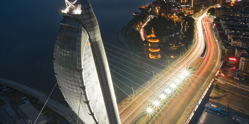 臨江橋全長433.5米,北起新蕪路與吉和南路交叉口,跨越青弋江,南接濱江南路,雙向六車道,主橋長173.5米,於2008年1月6日通車。這座寓意“魚米之鄉”橋塔的設計者、來自同濟大學的吳沖教授。位於青弋江和長江交匯口處的臨江橋設計為單塔斜拉索橋,主塔高73.5米,呈魚的形狀。設有6層觀光平台,遊客可乘電梯直上塔頂觀光。開始的靈感就是來自蕪湖是一個魚米之鄉。”把蕪湖本地的特色融入這座建築中,於是就設計了這座江邊高塔,鋼樑是魚的脊樑,鋁合金面板和玻璃幕牆就是魚鱗。充滿着蕪湖特色。