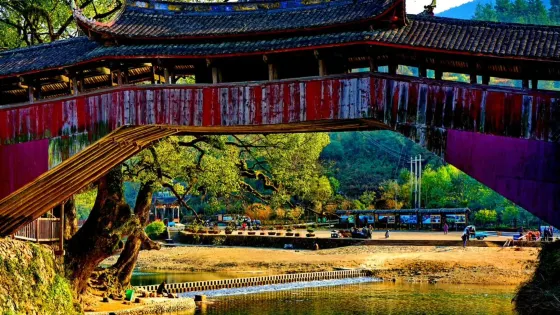 則評價溪東橋位於泗溪鎮,因橫跨鎮內東溪之上而得名。此橋建於明隆慶四年(1570),清乾隆十年(1745)重表,道光七年重修。整個橋長41.7米,寬4.86米,高10.35米,橋屋15間,中央三間是宮殿式主樓,構架飛檐翹角。橋棟上麪塑造“螯魚雙吐水”,棟下塑造“唐僧取經”及梅、蘭、竹、菊等諸多工藝,形態栩栩如生。橋頭飛挑,頗有吞雲吐霧之勢。橋面檐下,三間藻井,構造工藝精緻古樸,使橋身顯得更加秀麗堂皇。橋下溪水清澈,橋的另一側是一抹遠山,近處有兩座高山,獅子縫與將軍峯。據當地人講,此橋與其周圍環境形成了“將軍逗獅”的風水模式。紅色的橋身映襯在青山碧水中,更顯輕靈秀美。