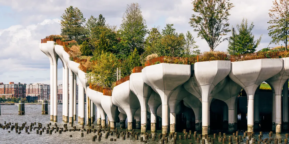 這座漂浮在哈德遜河上的人造公園,以鬱金香造型混凝土立柱托起,波浪形木棧道串聯多種微地形景觀。春季櫻花道與秋季紫菀花海交替綻放,冬季常青植物在鋼結構骨架間形成立體綠洲。