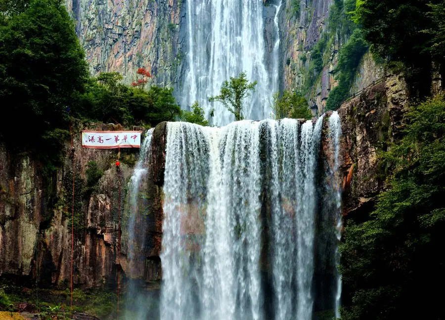 百丈漈,彙集“天下第六福地”南田諸水而成飛流,自海撥600餘米高山絕壁傾瀉而下,突奔於深壑巨澗之中,形成階梯型“三折”瀑布羣,總落差353米,單體落差207米,為華夏之一。水似飛珠濺玉,飄紗凝虹;聲如怒雷驚濤,撼山震地,蔚為壯觀。2013年被上海大世界基尼斯總部認證為“中國單落差較高的瀑布”,同時入選“中國十大名瀑”。