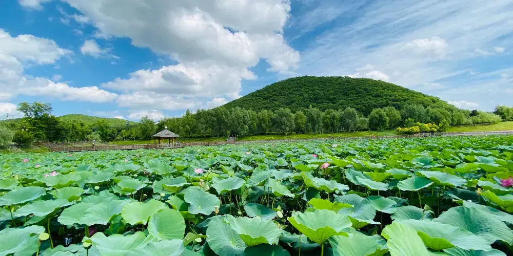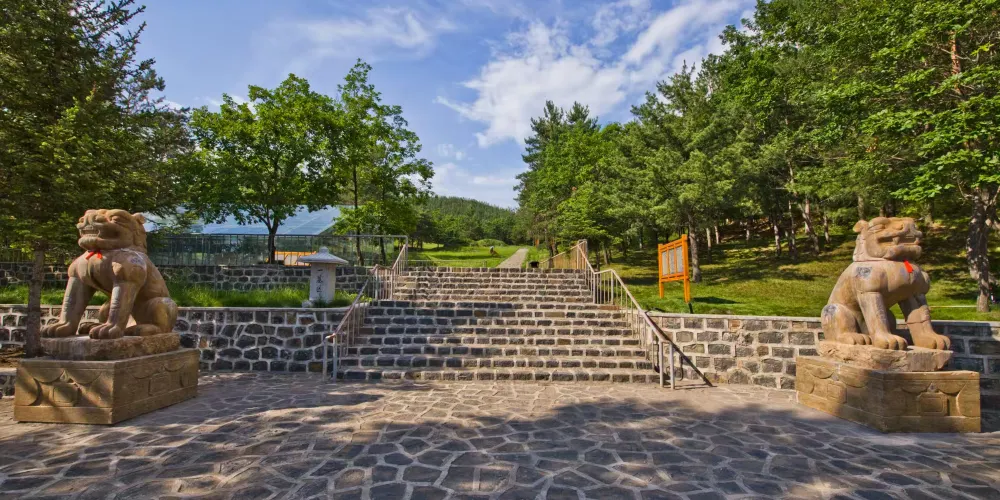 渤海國古墓群位於景區西北部的六鼎山中,公元698年,靺鞨粟未部首領大祚榮在敦化建立震國,後被唐玄宗冊封為渤海郡王,傳世二百多年。作為渤海國早期王室的陵寢,六鼎山古墓群建制古樸,與山形地貌渾然一體,如今可參觀的古墓群包括兩個墓區,大小墓葬一百餘座,其中在貞惠公主墓中發掘的石獅、墓誌銘等較為珍貴。
