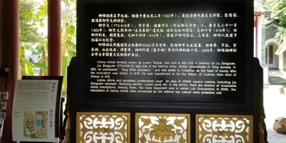柳侯祠原名羅池廟,位於柳州市中心柳侯公園內的西隅,是柳州人民為紀念唐代著名的政治家、思想家、文學家柳宗元而建造的衣冠墓。柳宗元,字子厚(公元773年-819年),唐代河東(今山西省永濟市虞鄉鎮)人,曾任禮部員外郎,因參加政治革新失敗被貶,晚年居官柳州(公元815-819年),做了許多有益於人民的事。他病死柳州之後三年,當地百姓建了羅池廟祭祀他。北宋末年,宋徽宗追封他為“文惠侯”,祠堂改稱“柳侯祠”。現在的柳侯祠是按照清代建築物重建的,祠內陳列有許多文物及史料,反映了柳宗元的生平和政績。