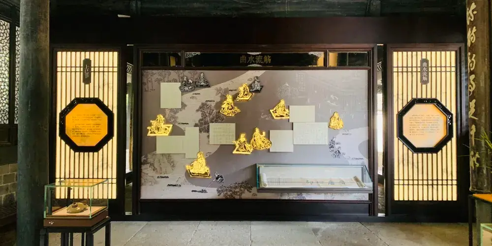 流觴亭位於流觴曲水處對面,麪闊三間,單檐歇山建築,呈長方形,飛檐翹角,冰紋門窗,四周有寬約米餘的走廊環繞,圍以石欄坐,古雅大氣。亭前有一彎彎曲曲的水溝,水在曲溝裏緩緩的流過,這就是有名的曲水。亭內陳列的是明朝永樂年間所刻流觴圖的拓片。在這裏我們可以清楚的看到當時作詩的情景:“一十一人詩兩篇成,一十五人詩一篇成,一十六人詩不成飲酒三觥”。當年王羲之等人就是列坐在曲水岸邊,有人在曲水的上游,放上一衹盛酒的杯子,酒杯有荷葉託着順水流漂行,到誰處停下,誰就得賦詩一首,作不出者罰酒一杯。當今很多遊人來到這裏,興致勃勃地用塑料杯子,盛上飲料,放在曲水裡“流觴”,體味當年曲水邀歡的情趣。