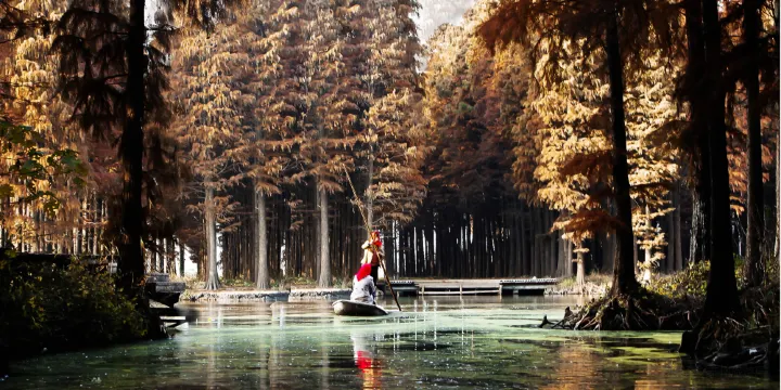 李中水上森林公園是人工生態林,栽種了適應水中生長的池杉、水杉等樹木品種,林中間種艿芋、油菜等經濟作物。如今栽種的10萬餘株水杉、池杉等品種樹木已長成高大茂密、生機盎然的水上園林。乘坐木筏穿梭在河道間,看大片樹木從水中挺拔而起,滿眼綠色,這個天然大氧吧是都市人回歸自然的好去處。