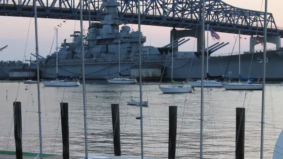 戰艦灣地處波士頓以南90公裡的Fall River城。這個海灣停靠著令人目不暇接的戰艦,有像麻薩諸塞號主力艦,約瑟夫•甘迺迪號驅逐艦,前東德席登塞號飛彈/導彈快艇和獅子魚號潛艇等等,十分雄偉。這裡是麻薩諸塞州最大的軍用艦船博物館之一,對于軍事迷而言絕對是不能錯過的。