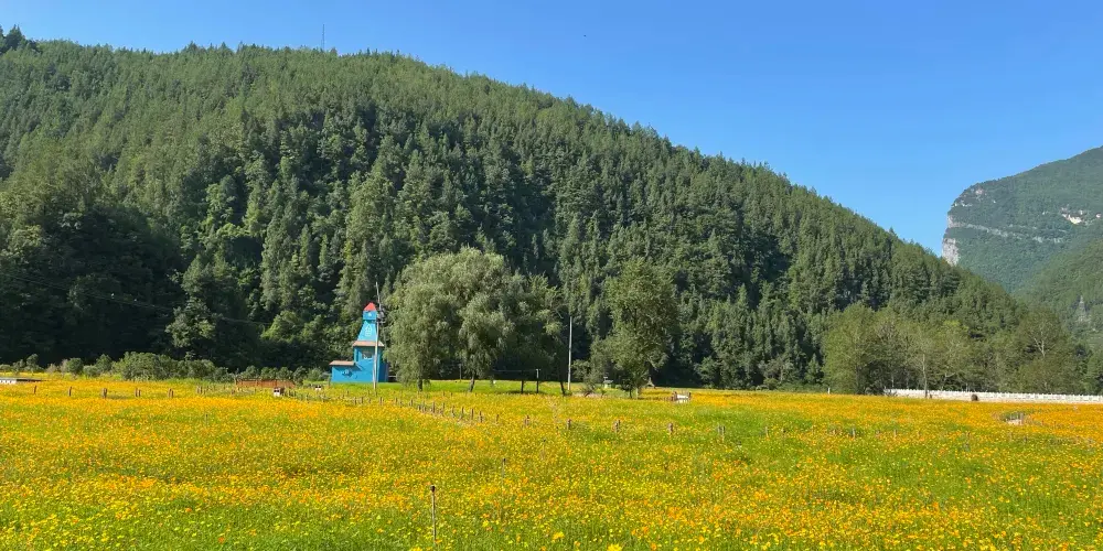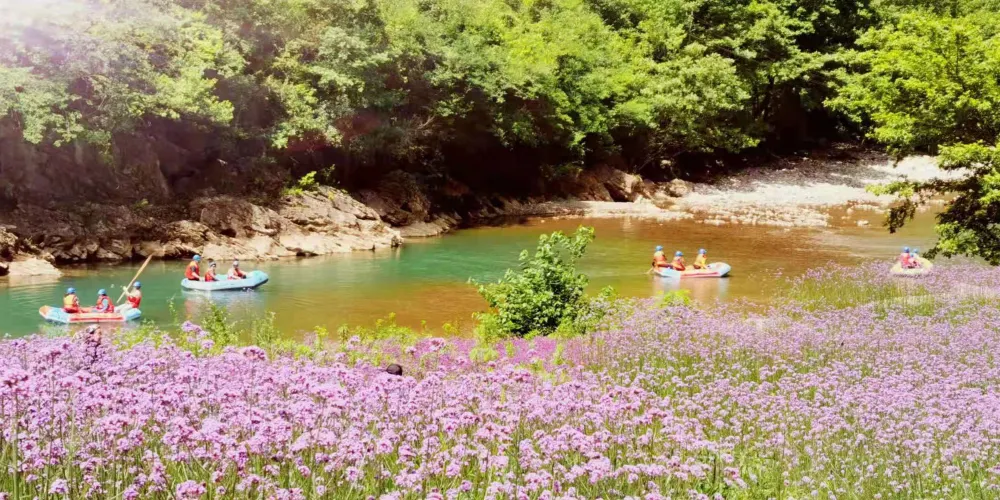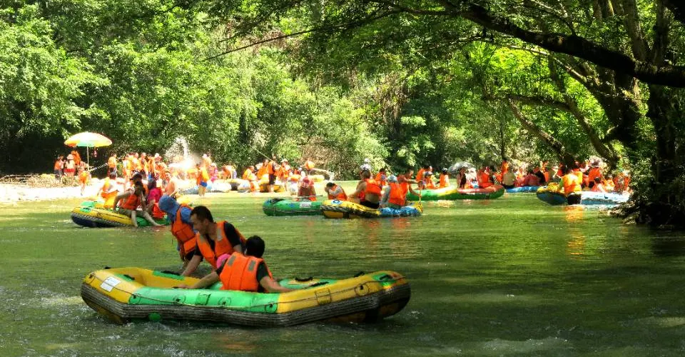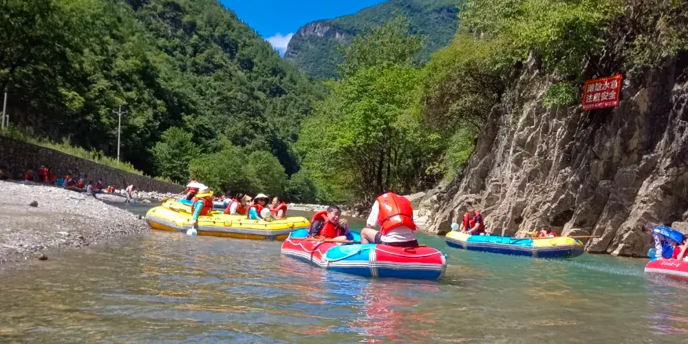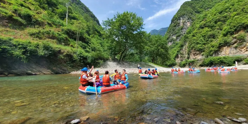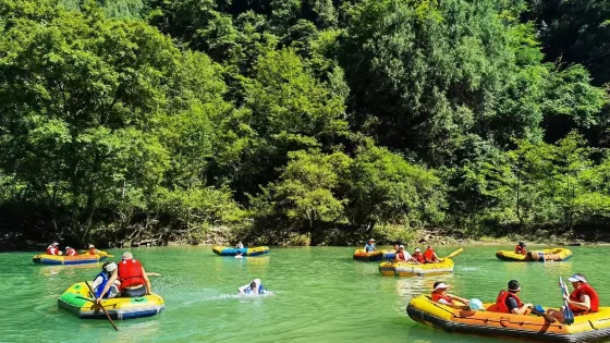 景區內有十峰八潭,兩岸綠樹蒼翠,風光無限美,漂流的彎道此起彼伏,偶爾水勢湍急,十分刺激。遊客可以乘坐皮筏艇,沿著蜿蜒的河道順流而下,體驗急流勇進的刺激與樂趣。在專業人員的指導下,遊客不僅能確保安全,還能享受到水流帶來的清涼與暢快。沿途的自然風光令人陶醉,兩岸的青山綠水交織成一幅美麗的畫卷,讓人在冒險之餘也能感受到大自然的寧靜與美好。