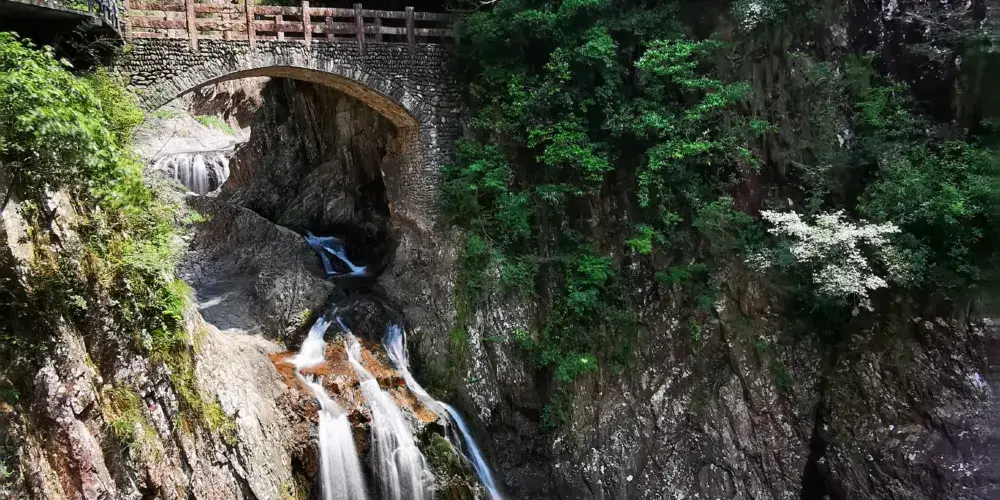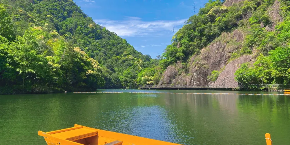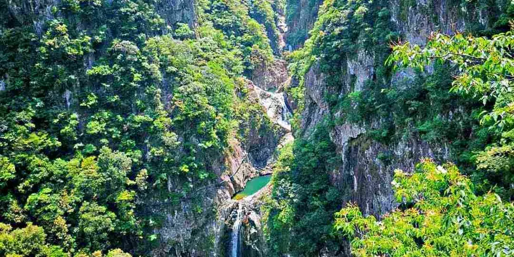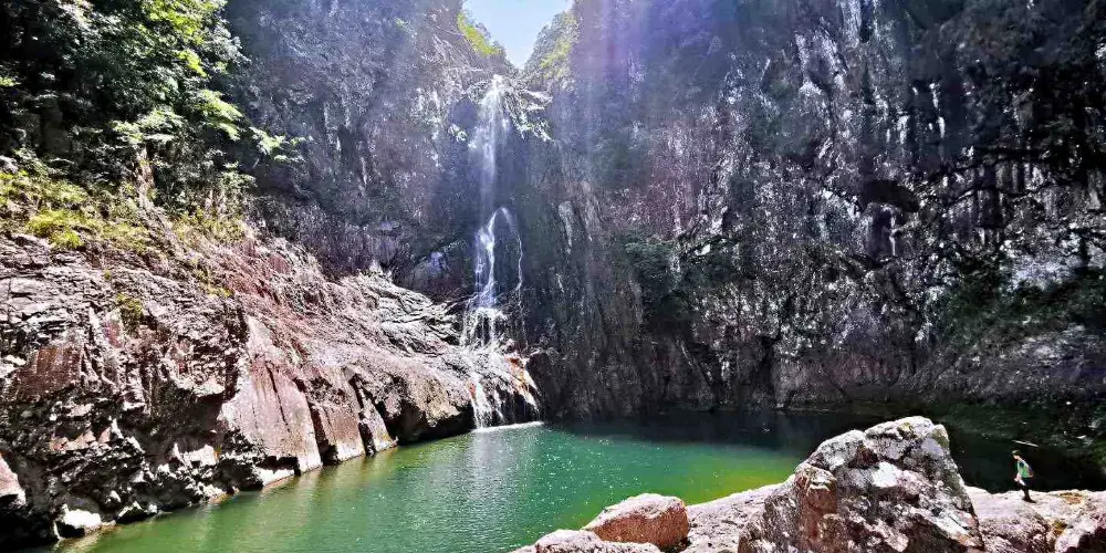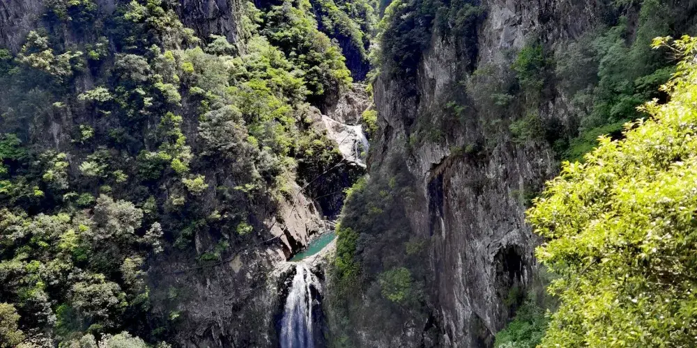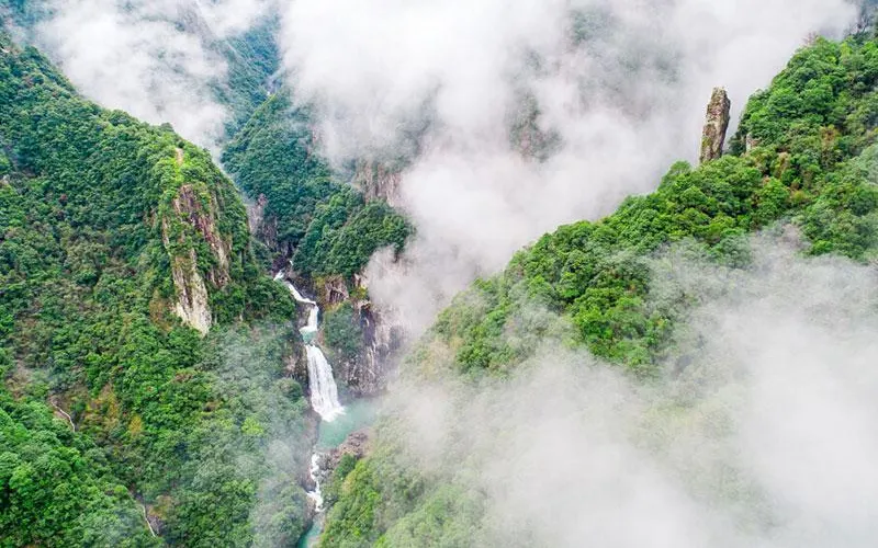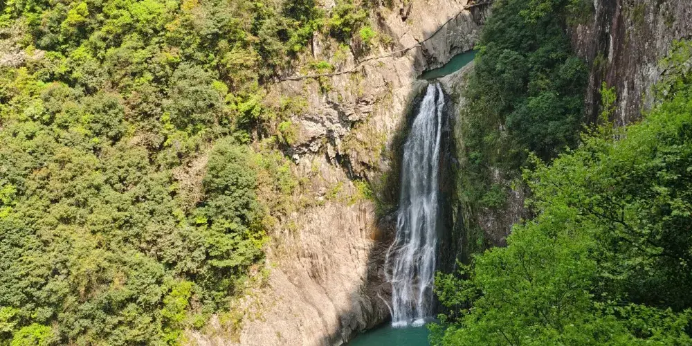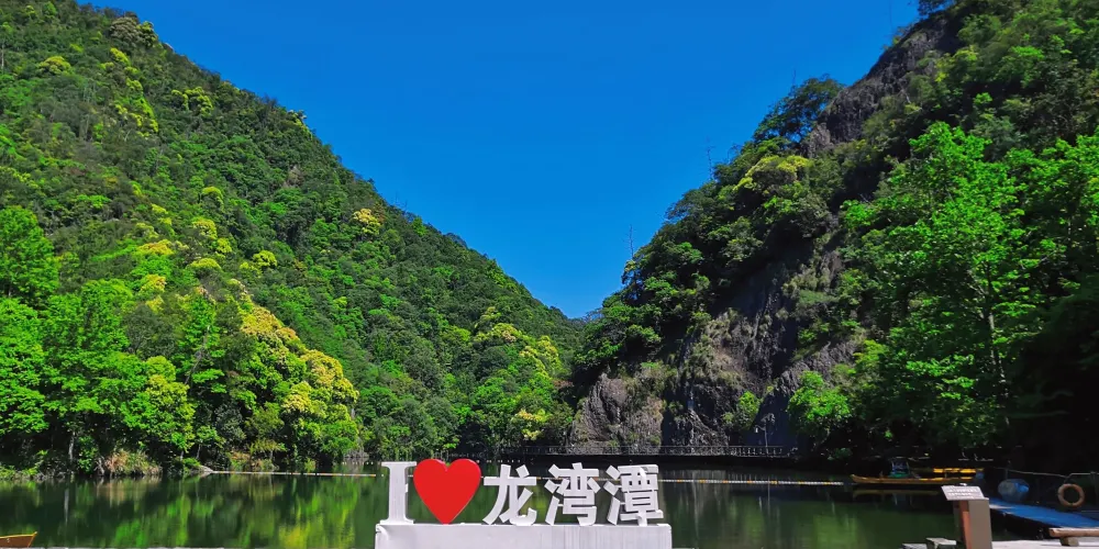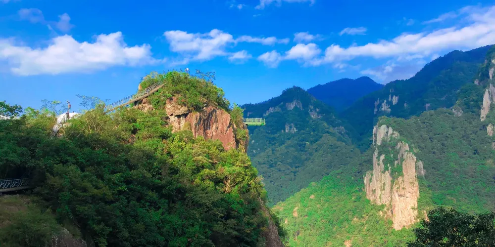 龍灣潭國家森林公園位於溫州楠溪江石桅岩景區,景區內因一條水流在山中形成的大大小小的瀑布而形成了一道亮麗的風景線。如果可以的話,沿著山間的棧道步行至山頂至高空玻璃觀景台,這個U型觀景台是整個伸出崖壁懸在空中的,膽大的你可以去走走。