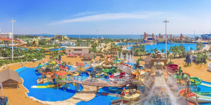 【德薩斯水世界】德薩斯水世界主題公園佔地約500畝,由世界級專業水上樂園設計公司“美國WTI”主筆設計、設備由“歐洲一品牌”Polin公司及加拿大白水西部製造及施工。以美國德克薩斯州牛仔文化以及石油開採熱潮等文化融入景區,配以當地沙漠景觀,整個景區充滿美國西部風情。7大區域32種遊樂設備,日接待能力達5萬人次,以超大體量、超刺激項目打造新鲜的水上遊樂體驗。眾多技術在全國甚至全球遙遙領先,包括約13000㎡的真空造浪池、亞洲超長303米的水上過山車、定製的穿山蛇滑道、亞洲超長巨峽激流河佩科斯河谷。阿拉莫海·海嘯造浪池13000平超大面積,全球罕見!可容納萬人戲水!真空造浪高達3米,任你徜徉在人羣與海浪中盡情比浪。響尾蛇峽谷·穿山蛇滑道全球專屬的穿山蛇滑道,高達18米,整條滑道的表面猶如一條生動的響尾蛇,鱗片清晰可見,給你直觀的感官刺激。303米超長水上過山車攬山瞰海303米超長水上過山車,玩轉刺激在阿拉莫海,讓你玩轉心跳,暢快尖叫。德薩斯沙塵惡魔園區內大型大喇叭滑道,按照家庭4人筏進行設計,大有可玩,適合家庭、團體一起接受挑戰。【海獅館】呆萌可愛的海獅是歡樂的來源,數十個表演節目,帶來歡樂的温馨時光。【暢玩嘉年華】德薩斯牛仔小鎮擁有超多類型的遊戲項目,12個大區域、約150種遊戲項目,讓成年人像孩子一樣為之迷戀,刺激好玩又解壓,讓你放肆浪一浪。刺激的搖擺牛仔、萌萌的旋轉啤酒桶、浪漫的旋轉木馬、可遠觀海景的時光摩天輪、超適合親子一起打卡的5大主題户外機動遊戲設備。【海田温泉】鼎龍灣海田温泉水源於地下約3000米深處巖石斷裂層,富含礦物質,從兩處深井取水,一號井出水温度45°,二號井出水温度55°。屬於偏硅酸氟泉。【遇見唯美海景】你想象中的冬日的海是怎樣的?無論你見過或不曾見過,鼎龍灣的海都值得被你期待,願你能看到你曾期待過的樣子。擁有綿延16公里的黃金海岸線的鼎龍灣,必將讓你的旅途變得與眾不同,沙灘大海、椰林樹影、日月星辰,你對大海的所有幻想,這裏都有。【打卡網紅景點】鼎龍灣·海之角棧道——向海中央延伸300米的海之角棧橋,是觀海及拍照的絕佳聖地。鼎龍灣·海風習習展覽館——紅白相間牆體,藍天白雲與萌趣石狗雕塑相繞,是鼎龍灣絕佳的拍照打卡之處。鼎龍灣·婚禮廣場——在海之畔,與心愛之人攜手漫步於此,與藍天,白雲,碧海,青草相伴,道不盡的浪漫與唯美。【觀看園區繽紛演出】豐富多彩的牛仔歡樂巡遊,歡樂有趣的小丑互動、動感熱辣的舞蹈、激昂人心的烏幹達鼓舞……各種表演輪番上陣,為你帶來熱情洋溢的視聽享受!