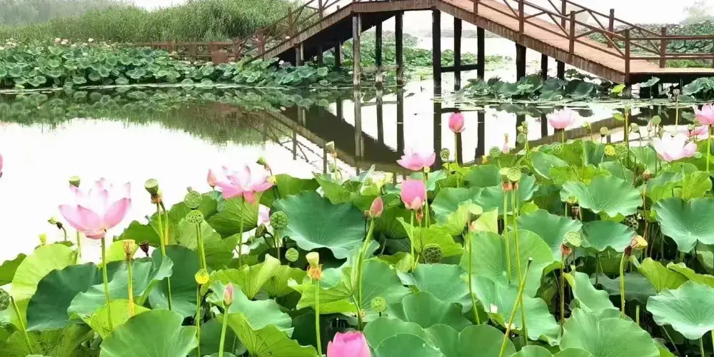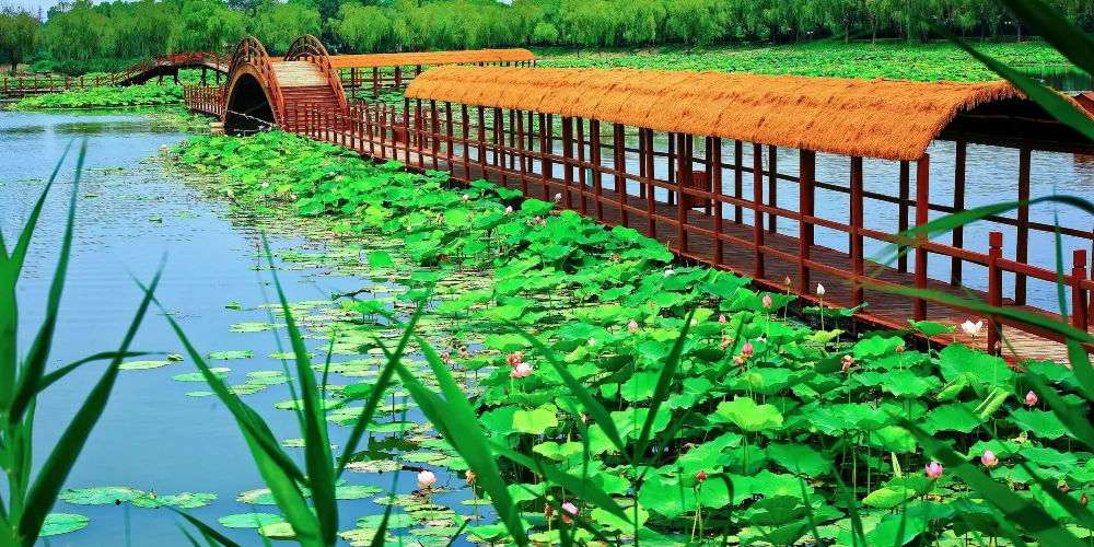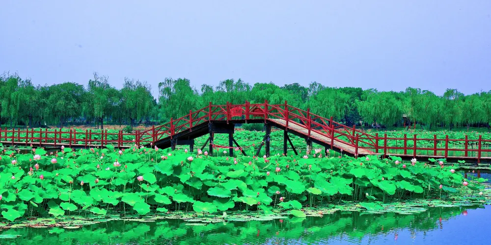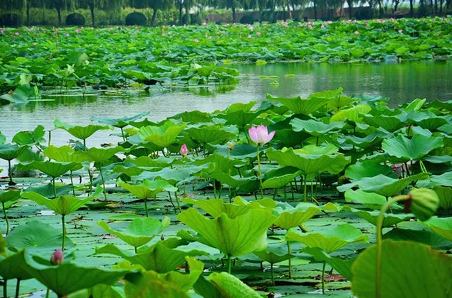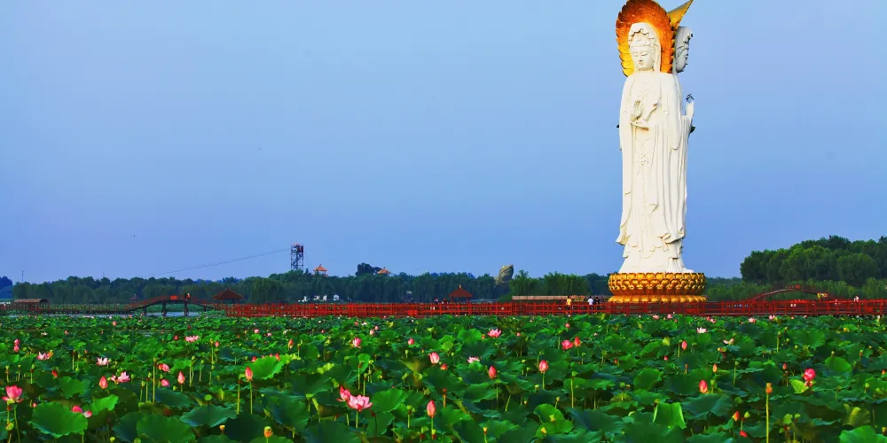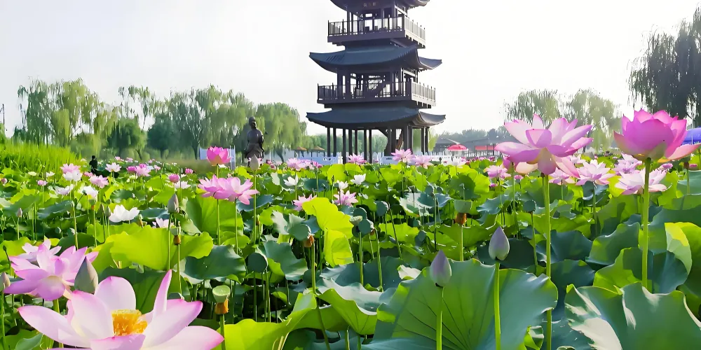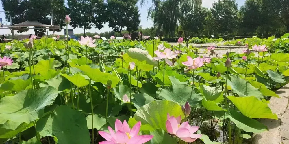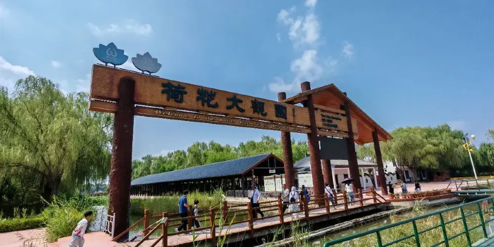 荷花大觀園景區內園區水生植物與水生動物相伴而居,成為我國北方大型的自然生態觀賞園。荷花大觀園景如其名,園中聚集中外名貴荷蓮上百種。株狀有巨型株南美王蓮,花型和花色豐富多樣,堪稱天下奇觀。荷花淀到花開之季,充分顯現詩句裡的美景。每年七月至九月,是所有種類荷花開得尤其旺盛的時候,也是該景區的旅遊佳季。