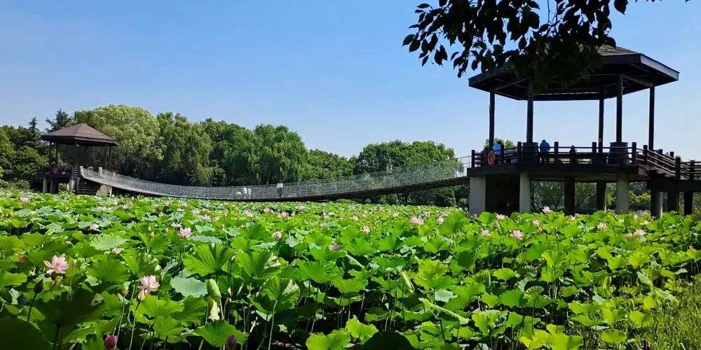 荷塘月色濕地公園是江南水鄉的一座荷花主題公園,園內引種了眾多種荷花水生植物,還有熱帶王蓮水景、蕩舟採蓮、烏篷船娘秀等特色遊覽項目。在蘇州,農曆六月二十四日為“觀蓮節”,被稱為荷花生日,也成為舉家賞荷觀蓮的盛大民俗節日。