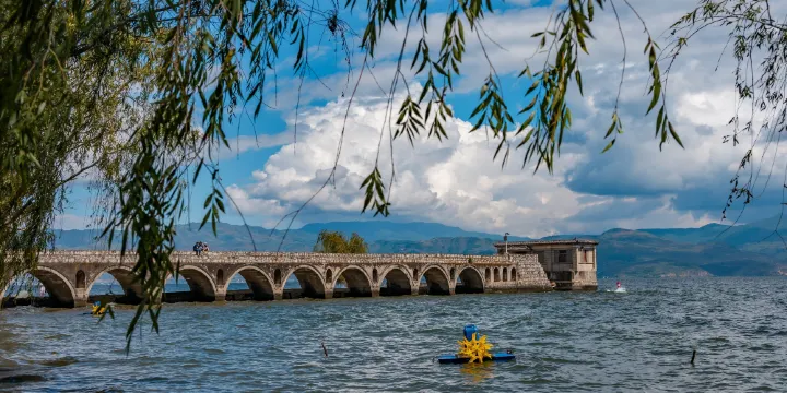 廊橋坐落於大理市灣橋鎮向陽溪村,是洱海邊備受歡迎的網紅打卡點。一開始是作為灣橋鎮的灌溉抽水渠,如今已轉變為遊客必訪的景觀地標。廊橋由九個獨特的半圓形橋洞構成,延伸至洱海,提供了豐富的觀景點。無論是站在橋上、橋下,或是透過橋洞,遊客都能欣賞洱海的迷人風景。廊橋不僅是環洱海騎行路線中的熱門景點,其獨特的橋洞設計為拍照提供了不錯的背景,尤其在強烈的日光下,光影反差效果令人驚嘆。交通方面,廊橋位置便利,從大理古城和喜洲古鎮均可輕鬆抵達。廊橋周圍環境清幽,是欣賞洱海美景的理想之地,適合遊客在此放鬆身心,捕捉美麗瞬間。