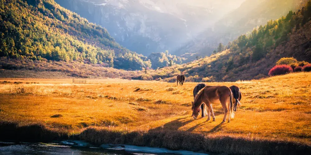 洛絨牛場是亞丁自然保護區有名景點之一,是附近藏民放牧的牧場。洛絨牛場背靠三座神山,是觀賞三怙主雪山的絕佳地點。牛場周圍是連綿的高山草甸,春夏時節草甸上野花盛開,漫山遍野,非常壯觀。貢嘎河從牛場穿過,成群的牛羊在河邊和山坡上悠閒的吃草,一派和諧景象。