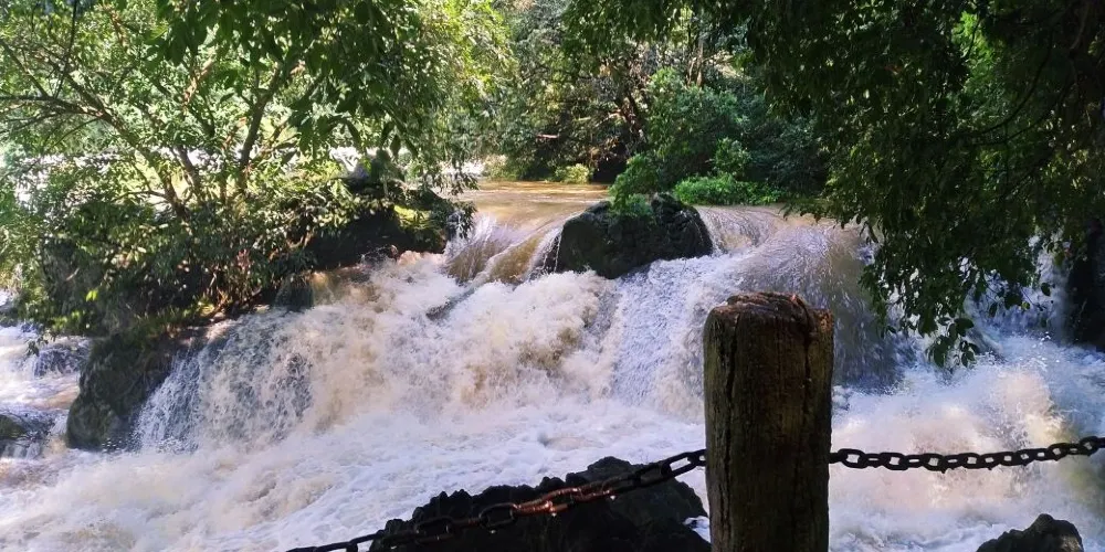陡坡塘瀑布有兩面,當平水期的時候,因為上游白水河水量較小,水流清澈,陡坡塘瀑布緩緩而下,清秀嫵媚像一層面紗,被戲稱為:新娘面紗。每當雨季來臨,白水河攜帶著大量泥沙洶湧而下,陡坡塘瀑布便失去了往日的溫柔,像奔騰的野馬,雄壯威武。