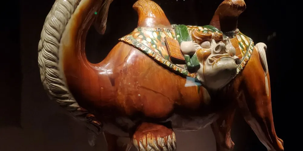 在洛陽博物館內,你可以看到夏代的青銅酒器「乳釘紋銅爵」;還有戰國時期的「錯金銀銅鼎」,這件青銅鼎以金銀作為裝飾,使用了鎏金、錯金銀等工藝,嵌金銀對稱和諧,裝飾華麗;以及北魏時期的「泥塑人面像」,這座佛像雖然因為大火,原有的彩繪損失殆盡,但這些卻絲毫沒有影響她的美麗;而唐代的三彩燈和三彩馬,色彩鮮豔,造型獨特,三彩燈的外形吸收了佛教藝術的內涵,三彩馬在造型上遵循著「圓方圓」的傳統構成法則,體現了唐帝國奔放向上的風範。