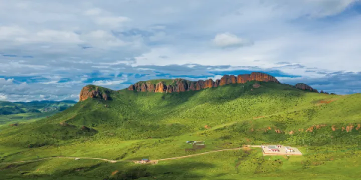 舒緩的山體頂部突拔起高聳的紅岩赤壁,夕陽殘照裡顯示出赤紅的色彩。觀看紅石崖的位置是與之對應的山坡,人們叫這裡為花蓋神山,也就是格爾底寺廟之後的山坡。