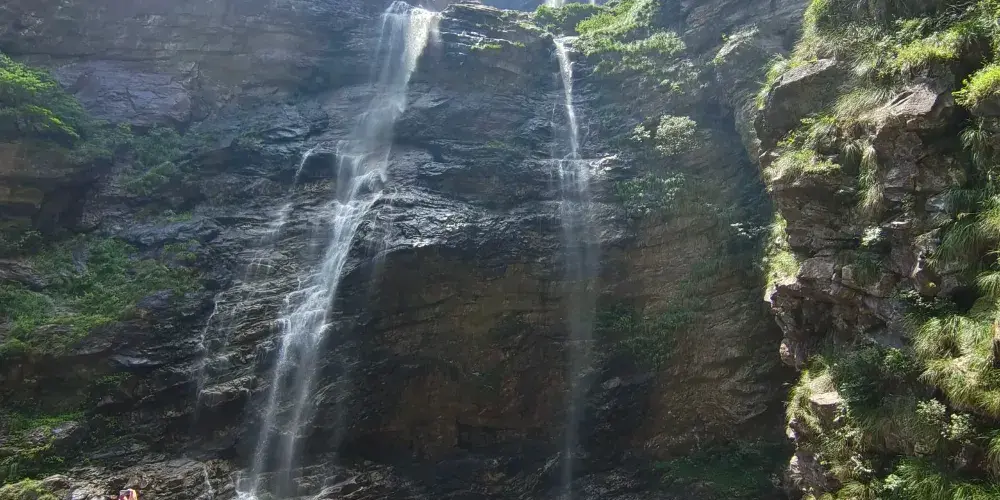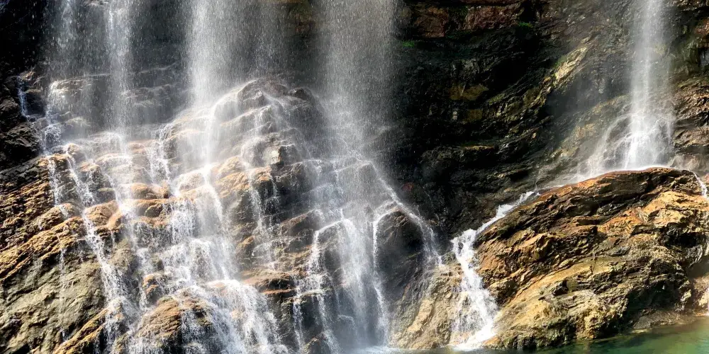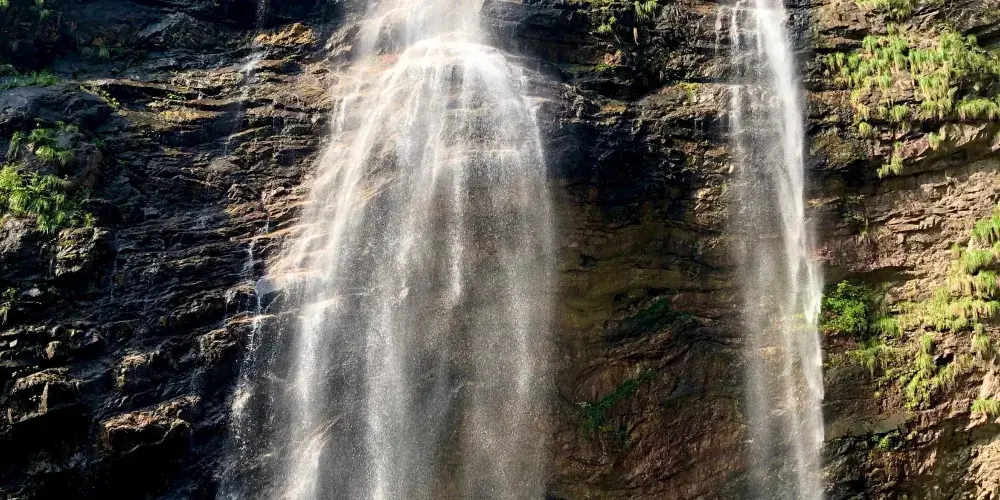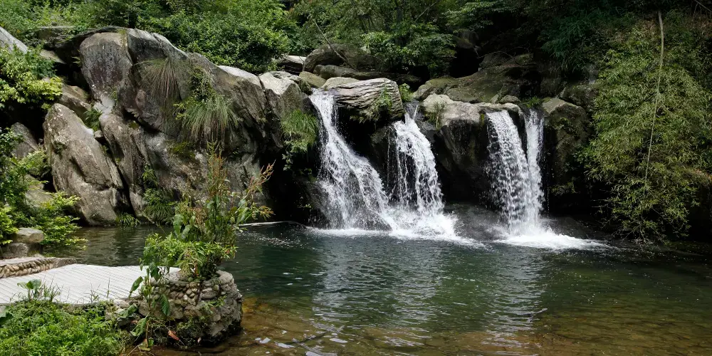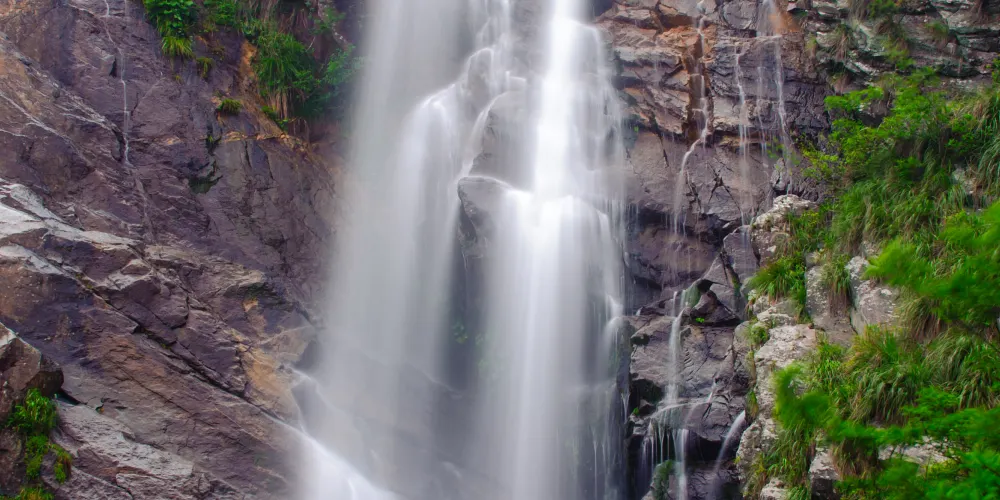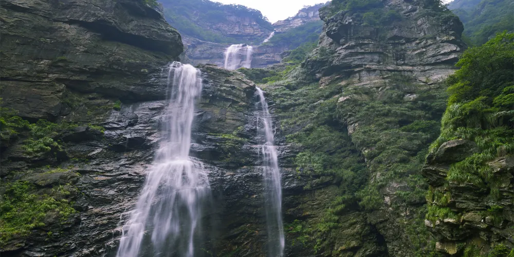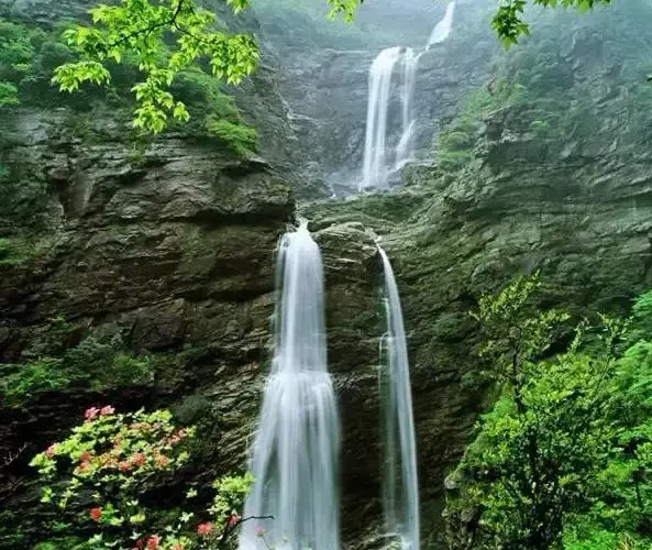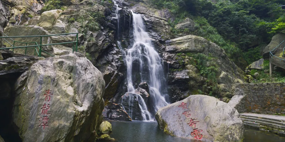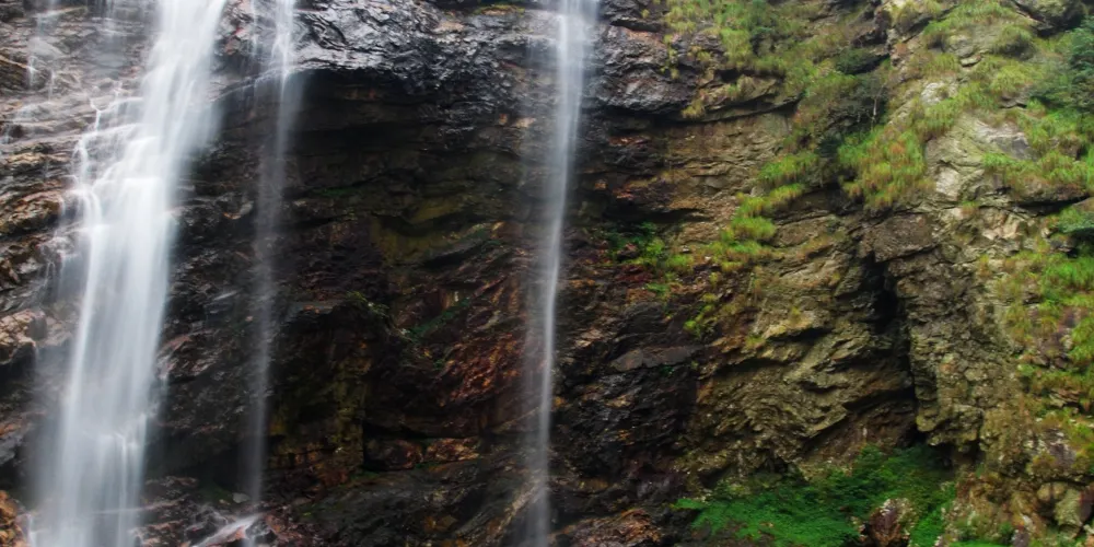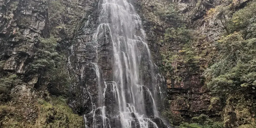 廬山瀑布位於九江市廬山市廬山風景區內,因唐代詩人李白的《望廬山瀑布》而出名。景區由三疊泉瀑布、開先瀑布、石門澗瀑布等部分組成,其中以三疊泉較為出名。站在三疊泉瀑布前的觀景石台上舉目望去,看見全長近百米的白練懸掛於空中,三疊分明,遠隔十幾米仍然可以感受到濕意撲面。