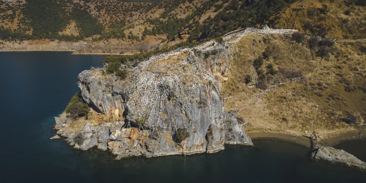 這是瀘沽湖的源頭,深處可達90餘米。此處石崖如削,景觀獨特,位於四川-雲南公路的邊上,四川一側的高地,這裡是很大的一個全景觀景平台,比較容易看到整個瀘沽湖的全貌,能看到瀘沽湖清澈的湖水,包車或者騎行環湖時會經過,同時也是户外愛好者攀巖和跳水的好位置。山崖上有一座巨大的瑪尼堆,崖壁上也纏繞了細數不清的經幡,瑪尼堆在藍天的映襯下十分漂亮,是值得攝影的好地方。