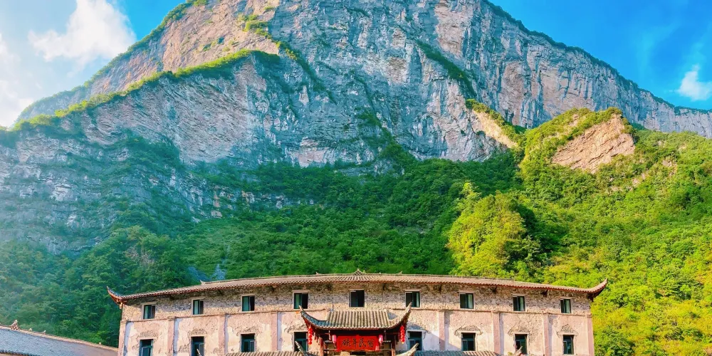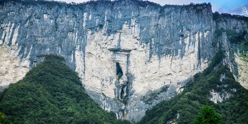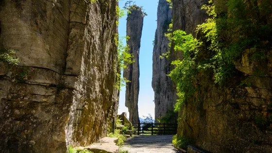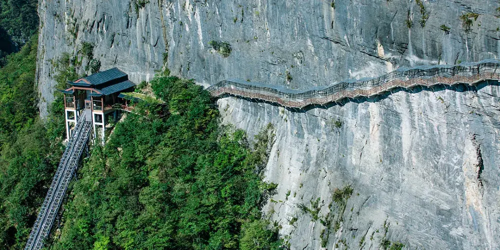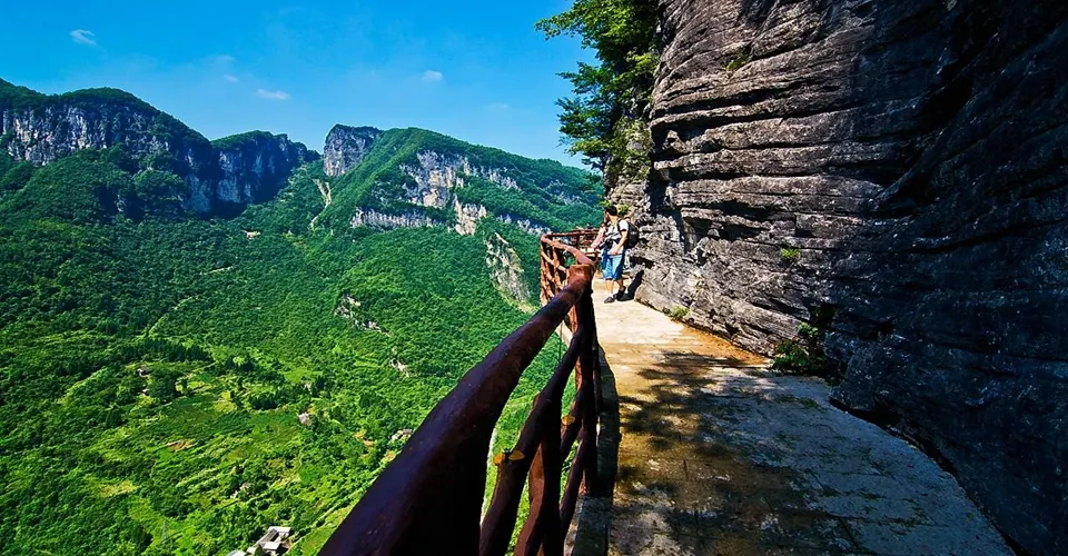 絕壁棧道,又稱步雲天棧、絕壁長廊:始建於 2006年8月,歷時1年又8個月建成。棧道位於山體東側的直立懸崖絶壁山腰,海拔約1700餘米,全長488米、高差達300米、石階118個,與山巖絕壁融於一體。因該棧道建於絕壁之上,所以也有人稱之為絕壁長廊,或“絕壁棧道”該工程是巴蜀古棧道製造技術與現代鋼筋砼建材、先進施工工藝的結合,科學安全,大氣壯觀。