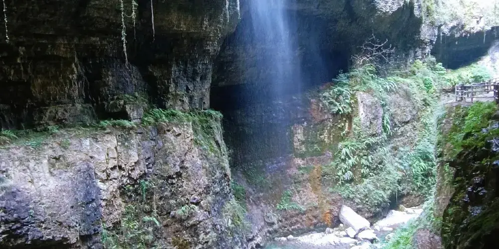 雲龍地縫景區,面積11.3平方千米,海拔600-800米。景區主要地貌景觀類型有地縫、瀑布、深潭、溶洞、地下暗河、象形石、地質剖面。雲龍地縫,平面呈“之”字型,近南北向展布,全長3.6千米,平均深達75米,平均寬度15米,河谷深邃,岸壁陡直,有“十里百丈絕壁”之稱,是雲龍地縫景區的主體觀光區域。雲龍地縫兩壁陡直,近於平行,上下寬窄基本一致,斷面呈“U”字形,極為罕見,具有稀缺性、獨特性。