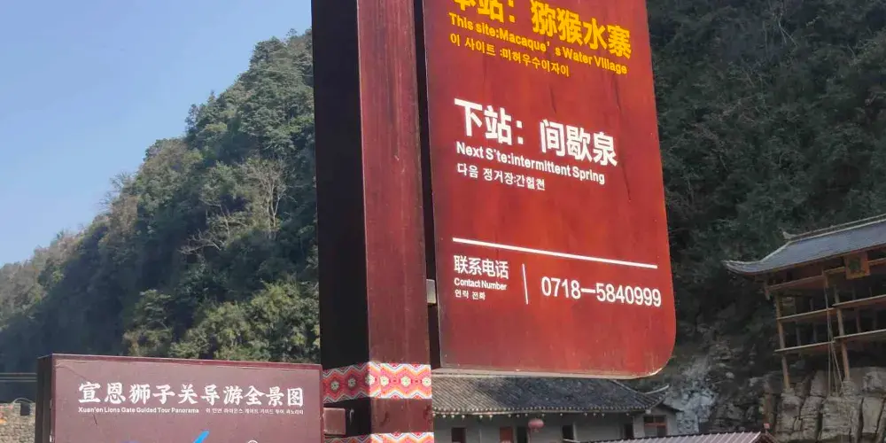 山地森林景觀、喀斯特地貌景觀、長達9.6公里環形山水峽谷、一壩雙庫水電站、優良水質水岸風光、野生獼猴自然保護區、非物質文化遺產宣恩土家八寶銅鈴舞,為您組成獅子關旅遊區經典的自然人文旅遊風景線。