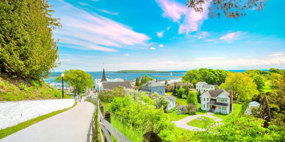 麥基諾島位於密执安湖之中,景色優美,曾入選世界十大最美小島之一,被譽為北美五大湖之瑰寶。島上自然風光宜人,植被茂密,湖面上鳥類一片生機勃勃。由於小島曾被英國人佔領,小島上海保存有相當完整的殖民時代建築,值得一看。小島上的著名特產麥基諾島軟糖,是島上唯一對外出口的產品,來到這裡一定要品嘗一番。小島可謂是一個室外桃源,與世隔絕,需要依靠私人飛機和渡輪才能到達,島上也沒有汽車,人們靠汽車和乘坐馬車出行。