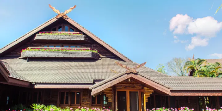 行宮全部採用木結構,以泰北傳統建築與歐洲瑞士典型的設計為藍本,屋頂呈金字形,外觀如同一座雕塑,簡樸、實用又不失高雅。內部分兩層,樓上是王太后的起居室,四間居室間間相通。在二樓的樓梯上刻著從1到9再到0的10個數字,象徵了人的生命輪迴。大廳的天花頂上滿是用松木精琢而成的雲彰圖案。