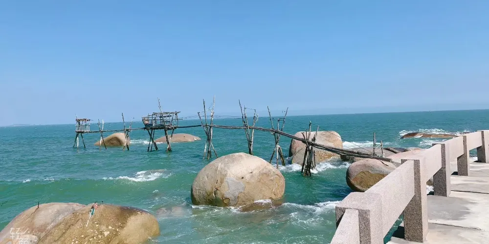 這裡是電影《左耳》的拍攝地、綜藝《我們來了》的取景地。靜泊在海上的漁船,與海釣的人們相映成趣,蔚藍的藍天和大海模糊了邊界,交匯在遠方。海灣旁邊刷滿馬卡龍色的民宿,更是將這座靜謐的小漁村襯托出了另一番風味。