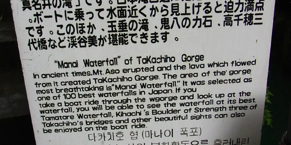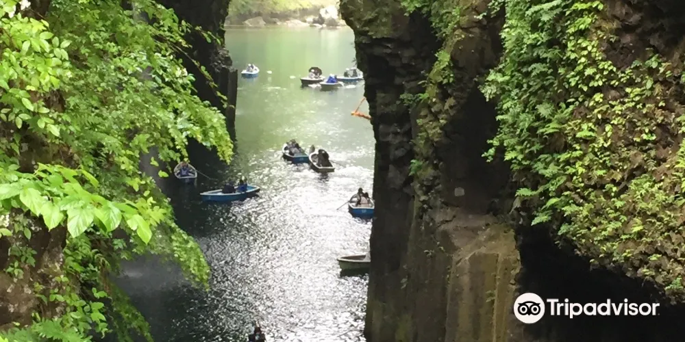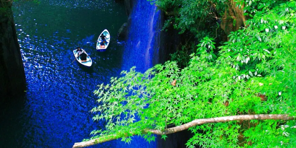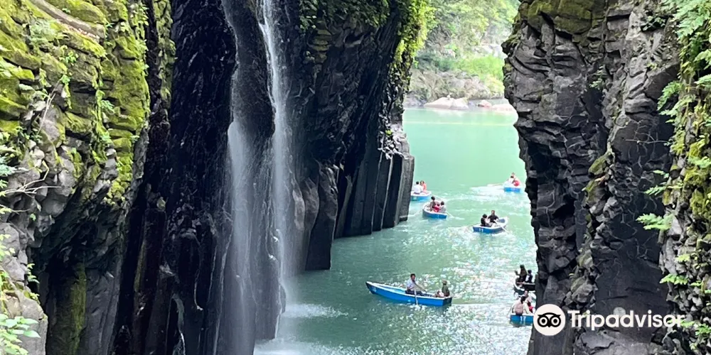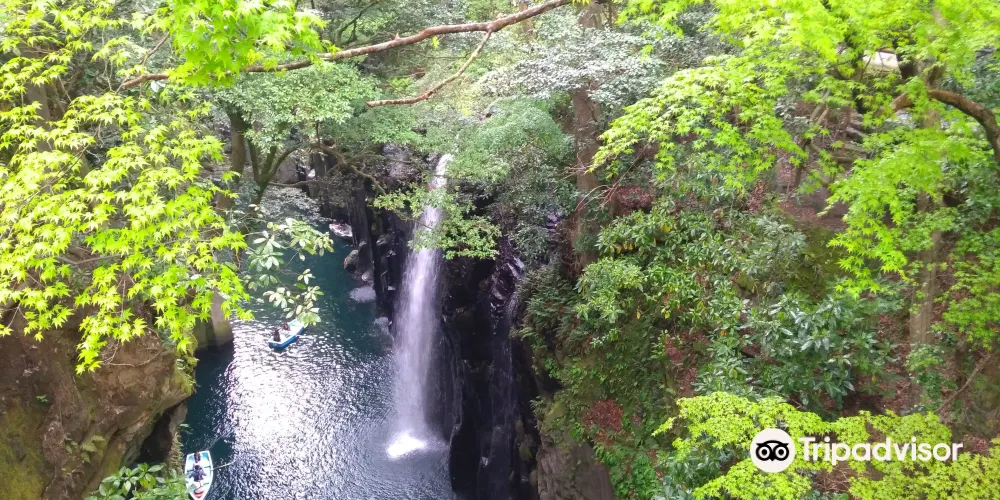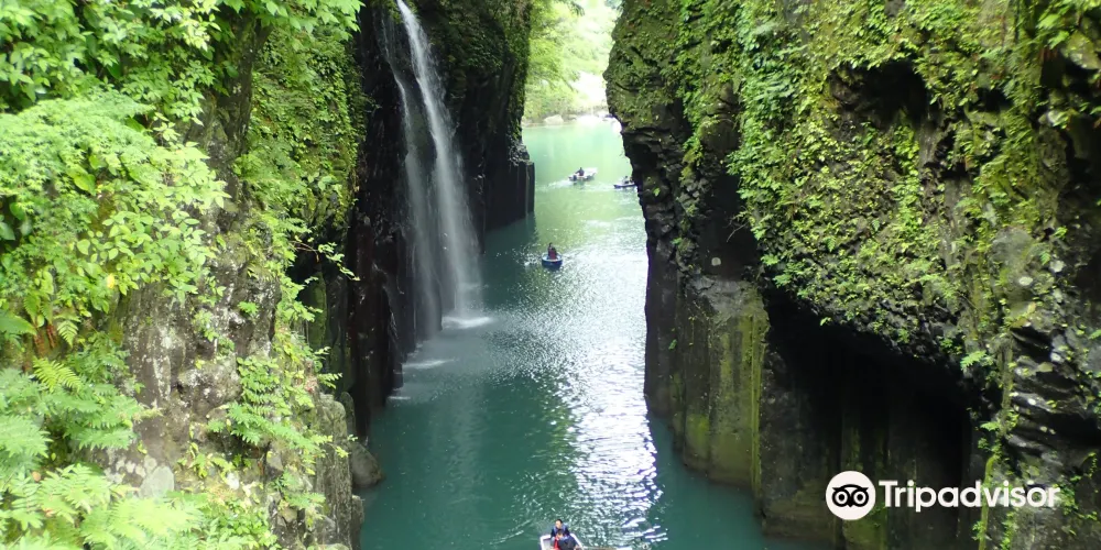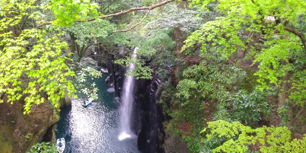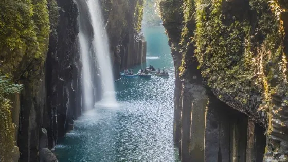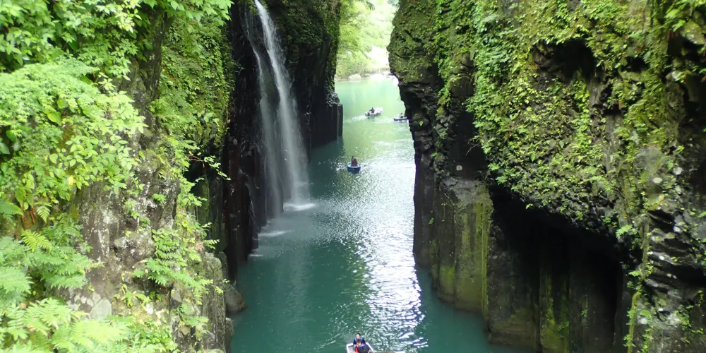 在高千穗可以看到許多宏偉的自然風光和古老神社,充滿神話世界般的神祕感。其中最受歡迎的景點就是高千穗峽谷!五瀨川侵蝕阿蘇熔巖而形成的V字形峽谷,部分峭壁高度甚至超過百米。也可以租一艘小船順流而下,近距離觀察美麗的「真名井瀑布」。在春天和初夏,懸崖上開滿了山櫻花、杜鵑花和紫藤花,秋天有絢爛的紅葉,冬天這裏則幻化成冰的世界。四季皆有不同的景色可以欣賞。