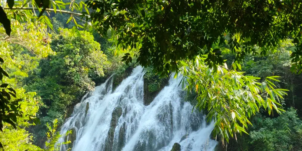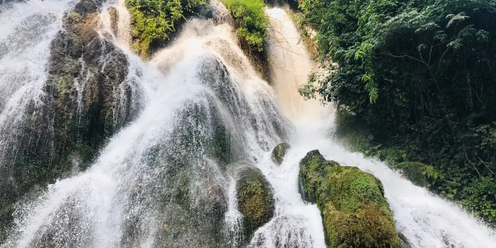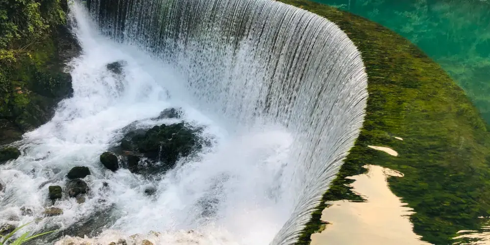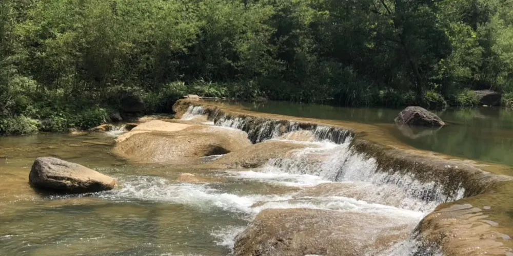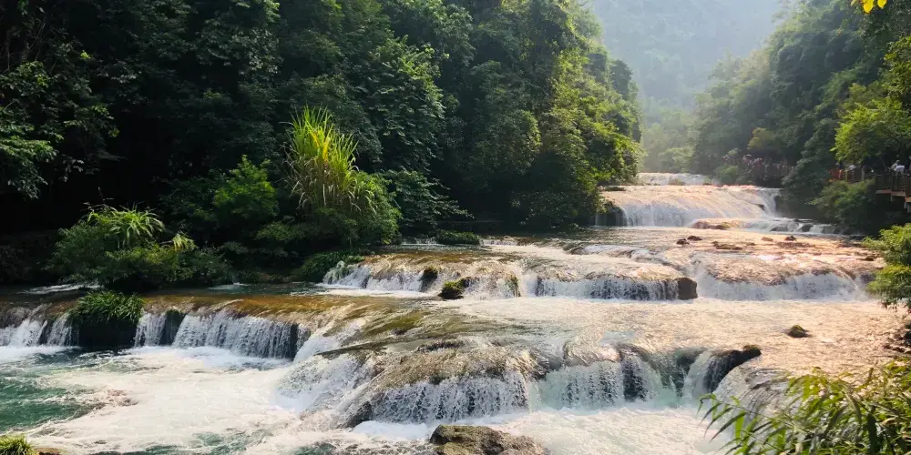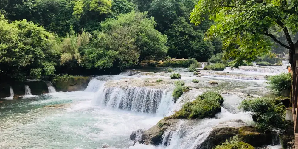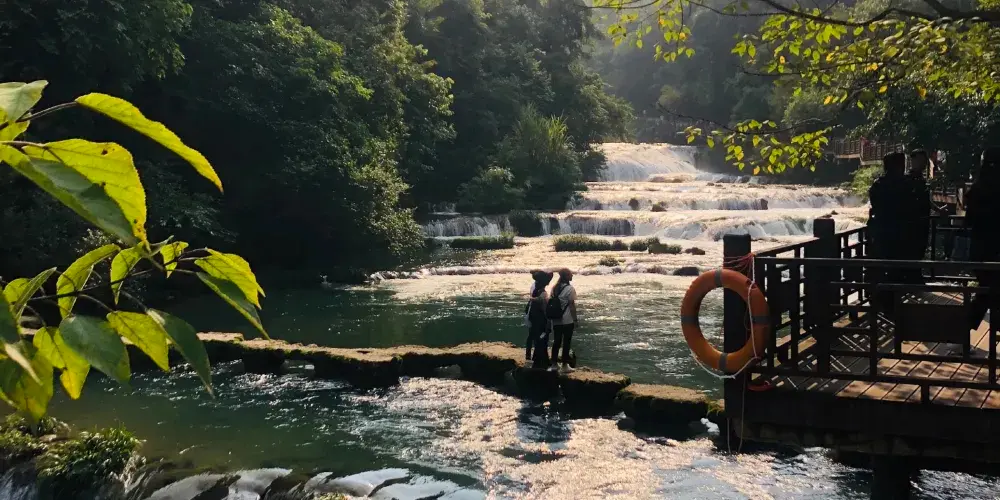 小七孔景區-卧龍潭源源不絕的綠水從壩上滾下,形成龐大的特色瀑布,瀑佈如絲,月牙的形狀猶如一把仙人梳。站在壩側岸頭,小七孔景區-卧龍潭的美景一覽無餘,薄霧濛濛,尤入仙境,讓人震撼不已。