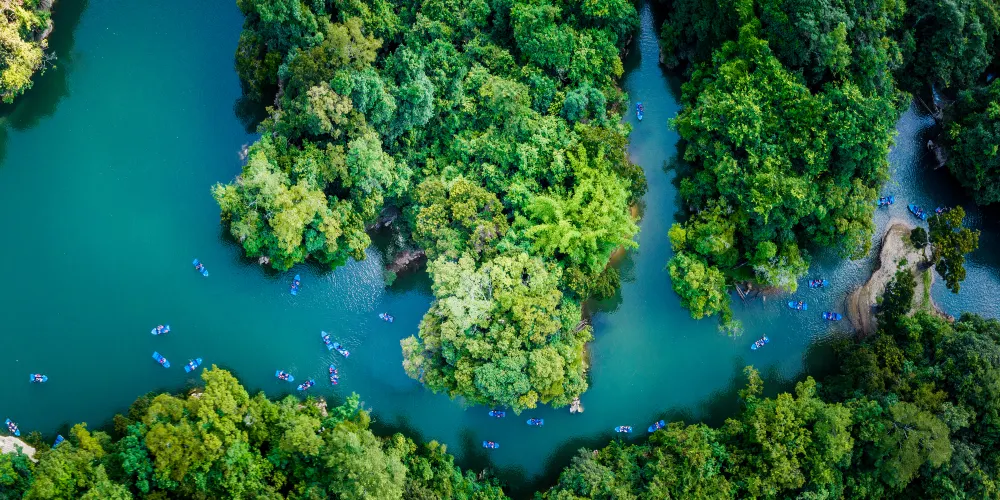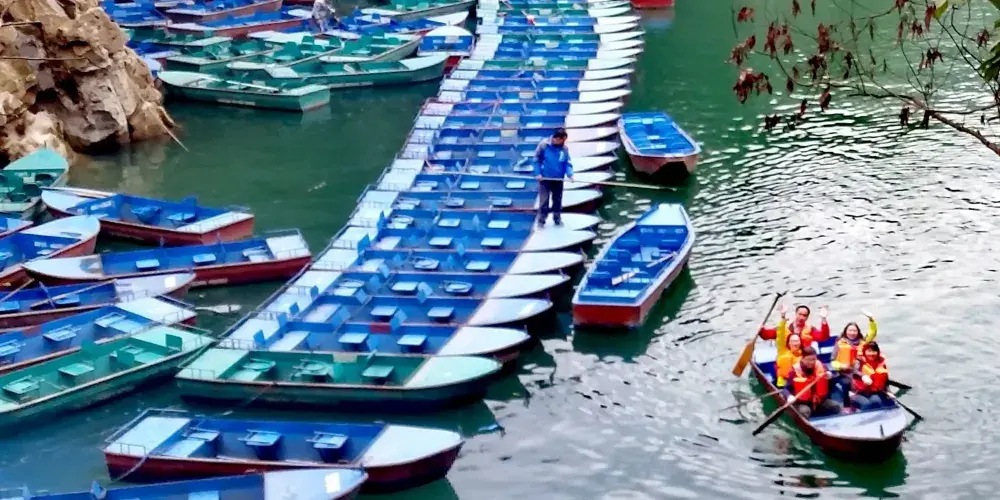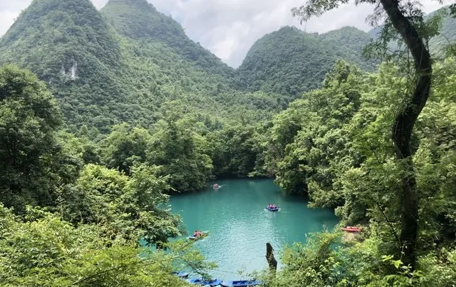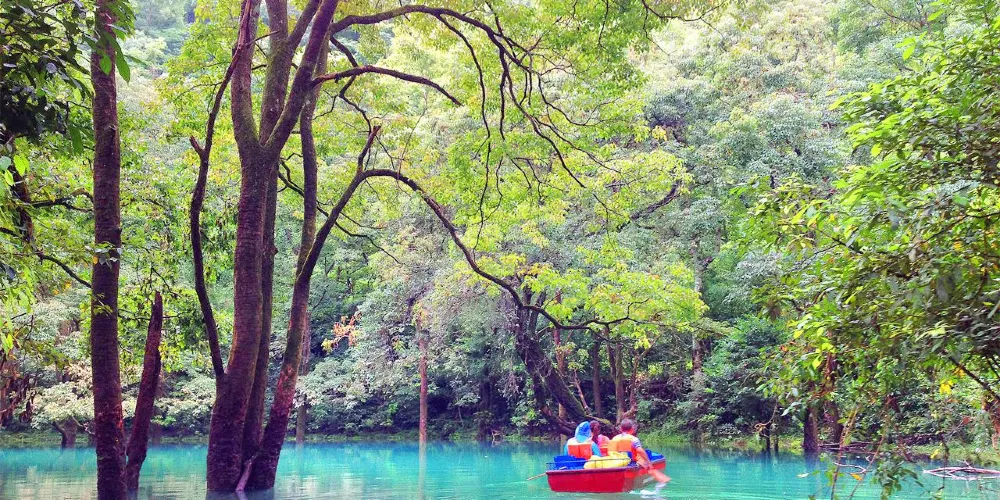 小七孔景區-卧龍潭是喀斯特暗河臥龍河的出口,也是荔波小七孔景區的一個經典景觀,因攔河壩形成的綠水深潭、滾水瀑布及傳說的臥龍而得名。從地表看它只是臥龍河的源頭,之後因為築壩發電引入響水河,成為了兩河的總水源。