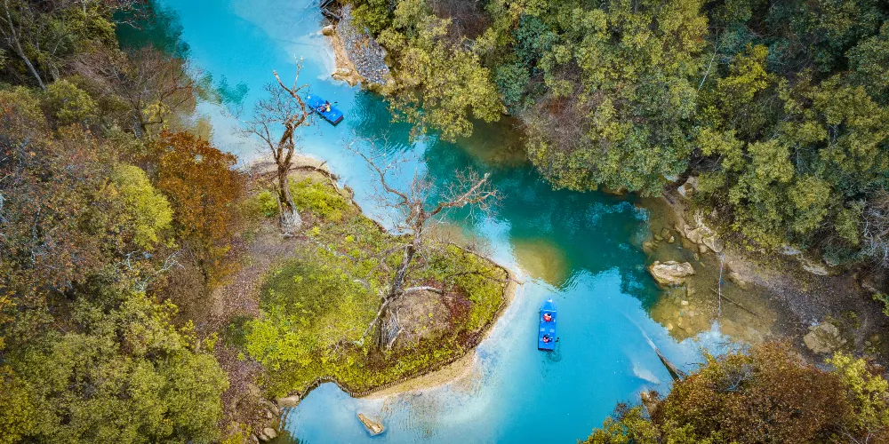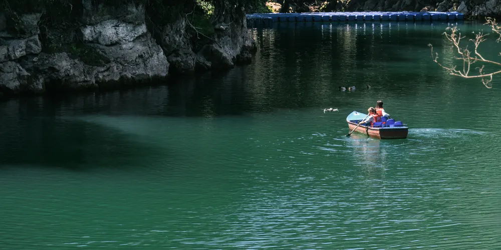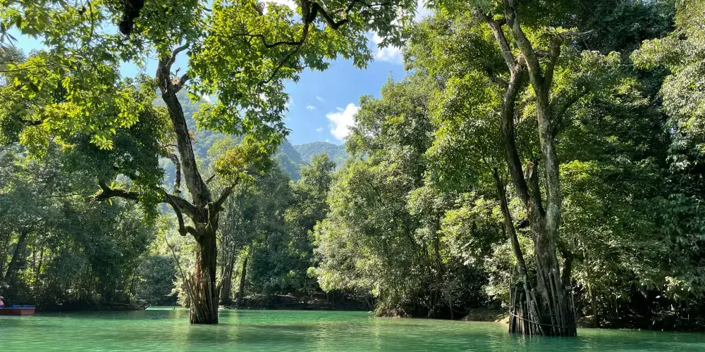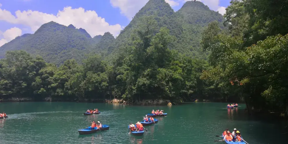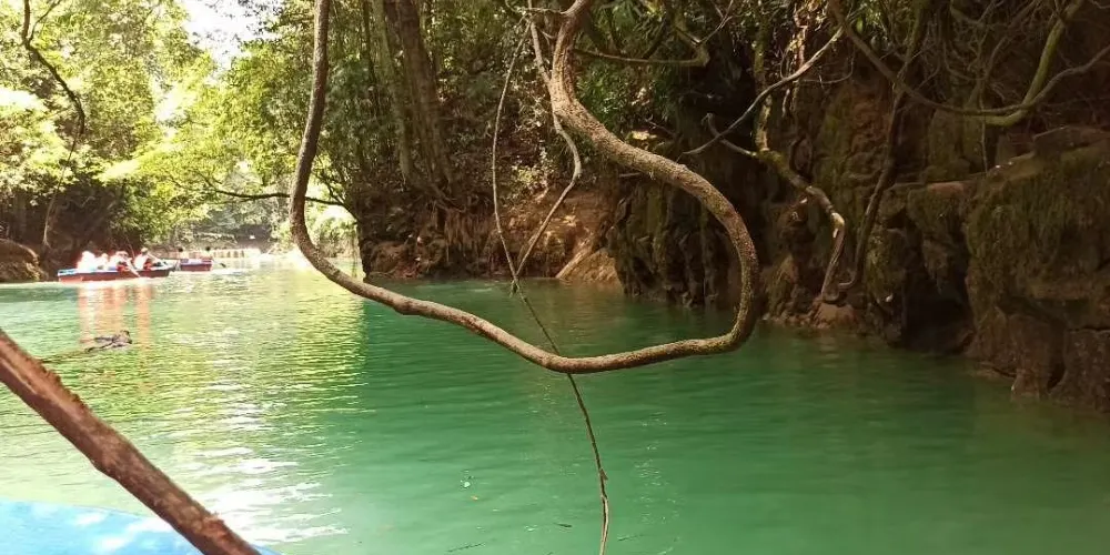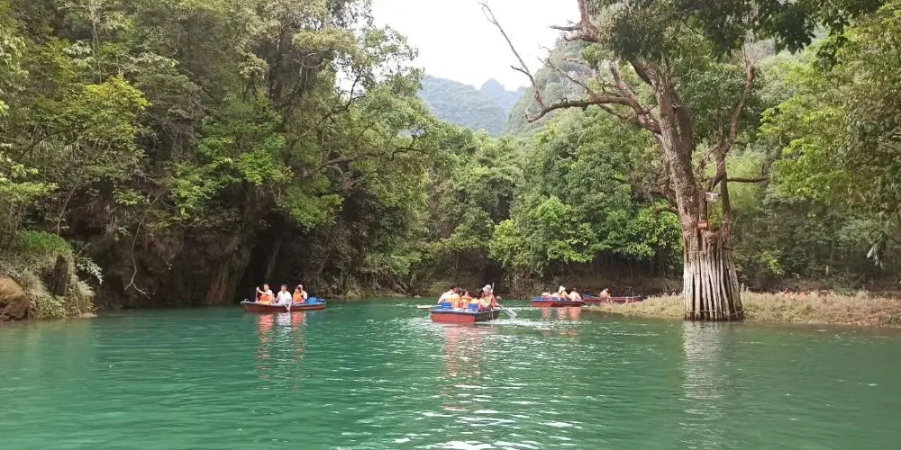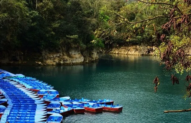 暗河從崖底湧出,由於潭邊向下處有一道弧弓向內的擋水壩把水攔住,所以潭面猶如鏡子般平靜,只有壩上的滾水瀑布和潭外川流不息的渠水,才能讓人感受到河水在潭底的翻動。潭邊怪石奇樹林立,潭外水聲轟鳴,四周高山緊鎖。水潭猶如地底深淵,水面湛藍清澈,岸上的峰巒、綠樹、竹林倒映潭中,色彩斑斕絢麗,置身其間,宛若畫中游。