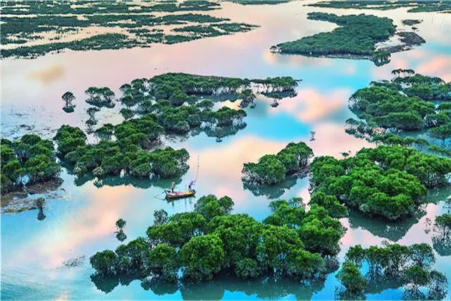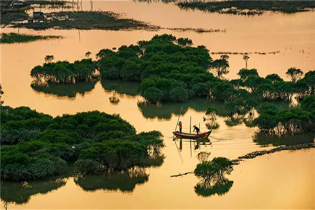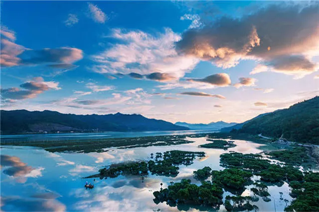 在鹽田鵝灣村附近的灘涂有一片小小的紅樹林,隨著潮起潮落,或露出灘涂或與海水渾然一體,再加上鮮豔的小漁船點綴其中,給霞浦帶來另一番風情。樹林把灘涂又隔成了一條條蜿蜒曲折的水道,小船行駛在這天然植物組成的水道上,構成了一幅美妙絕倫的圖案。