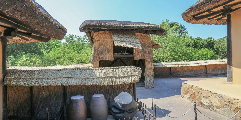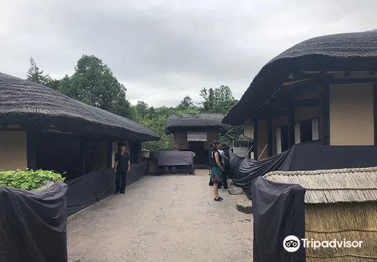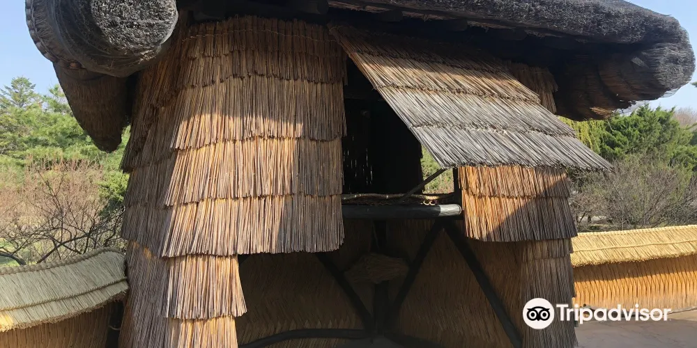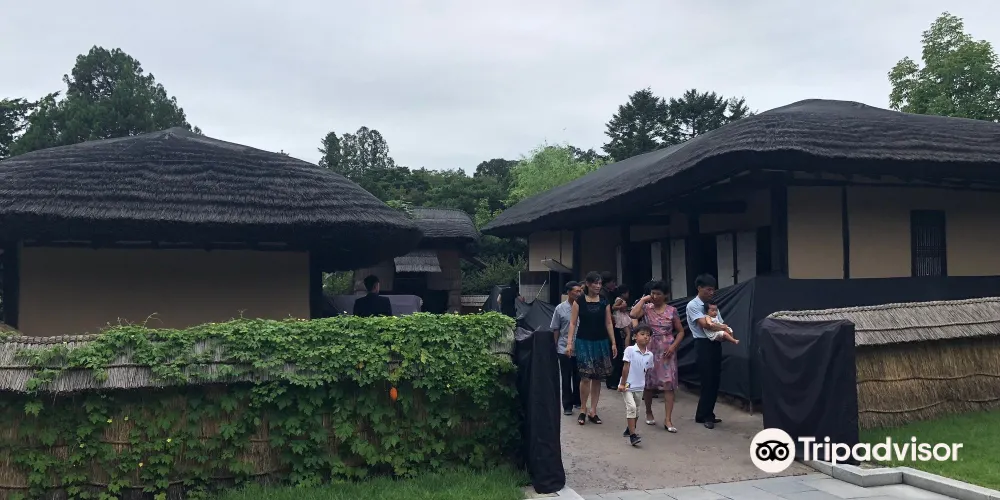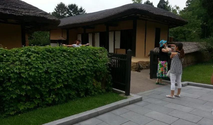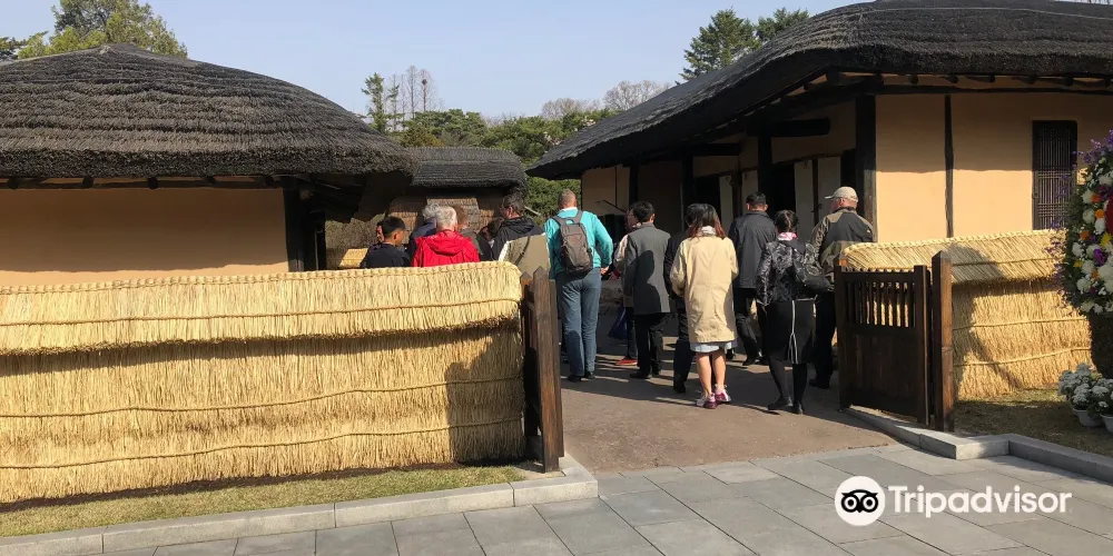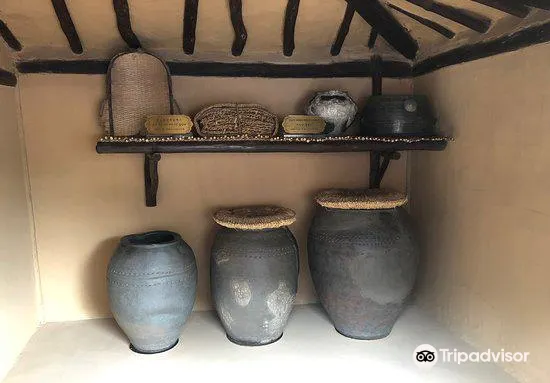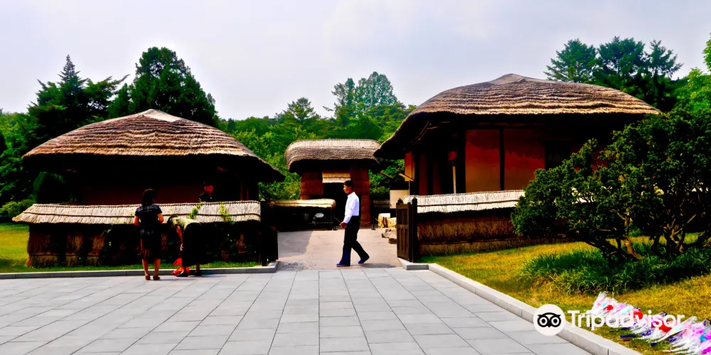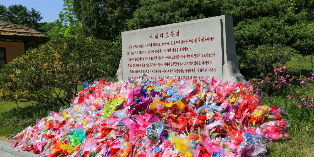金日成故居由二間草房、一座草樓、一間牛舍和一間倉庫構成。故居內露天陳列的一口歪七扭八的缸,據說這是金日成的母親因為家裡窮,買不起好缸而不得不購買的次品。