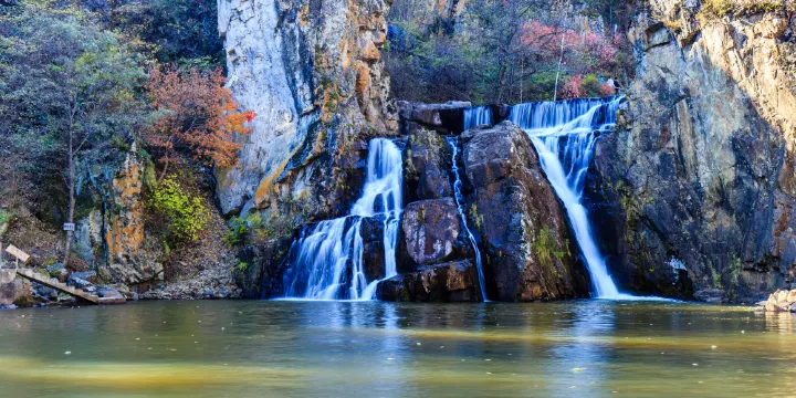 茅蘭瀑布位於茅蘭溝國家森林公園內,高約20米,寬約14米,落差約15.1米,四季飛湧不竭。每遇雨季,河水從高崖奔湧直瀉,如駿馬奔騰,勢如洶湧,如銀河傾瀉,萬練飛空,揭珠崩玉,勢不可擋。飛沫反湧,如煙霞騰空,其狀雄偉,聲震如雷,氣吞山河。晴天麗日,光照流彩,則有色彩斑斕的彩虹出現。枯水期時,瀑布則一分為二,右側形似珠簾,左側造型"人"字,各有特色,蔚為壯觀。