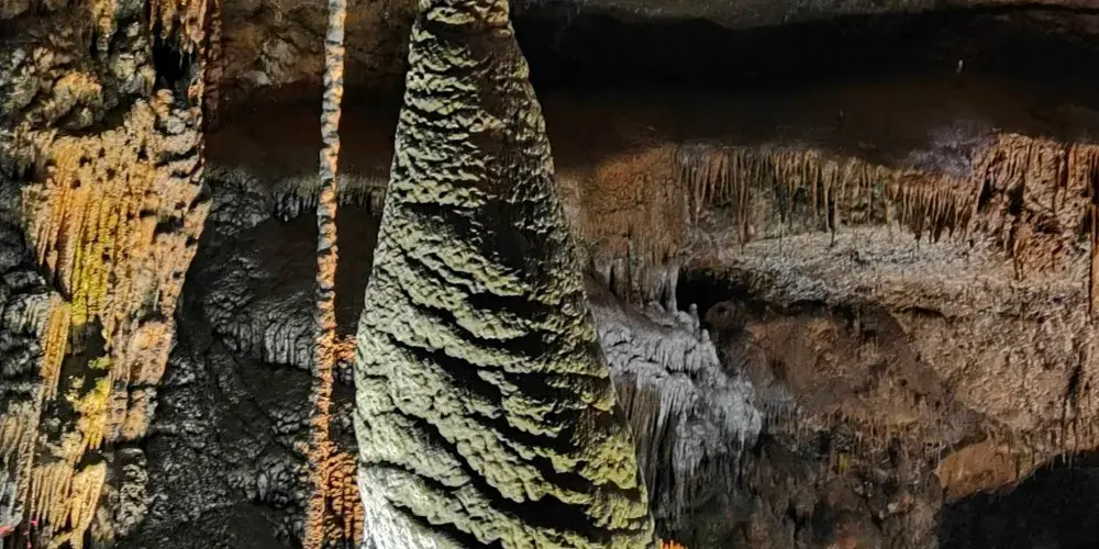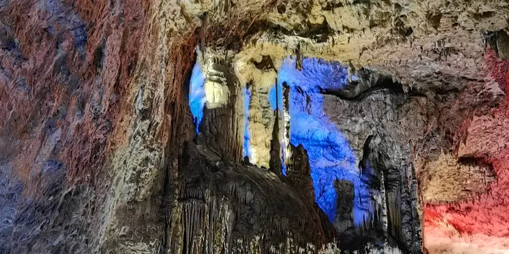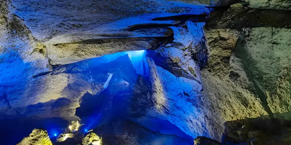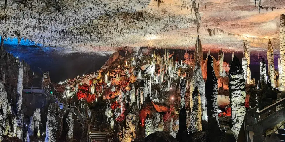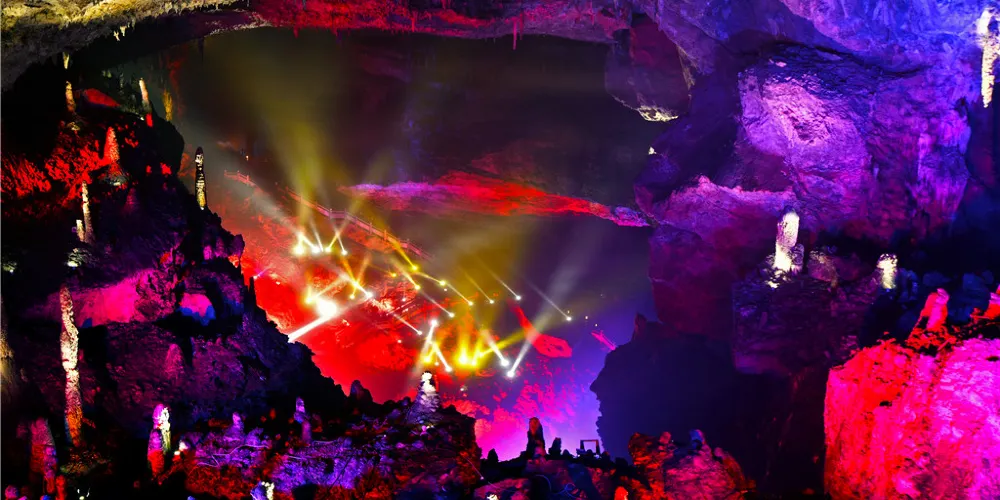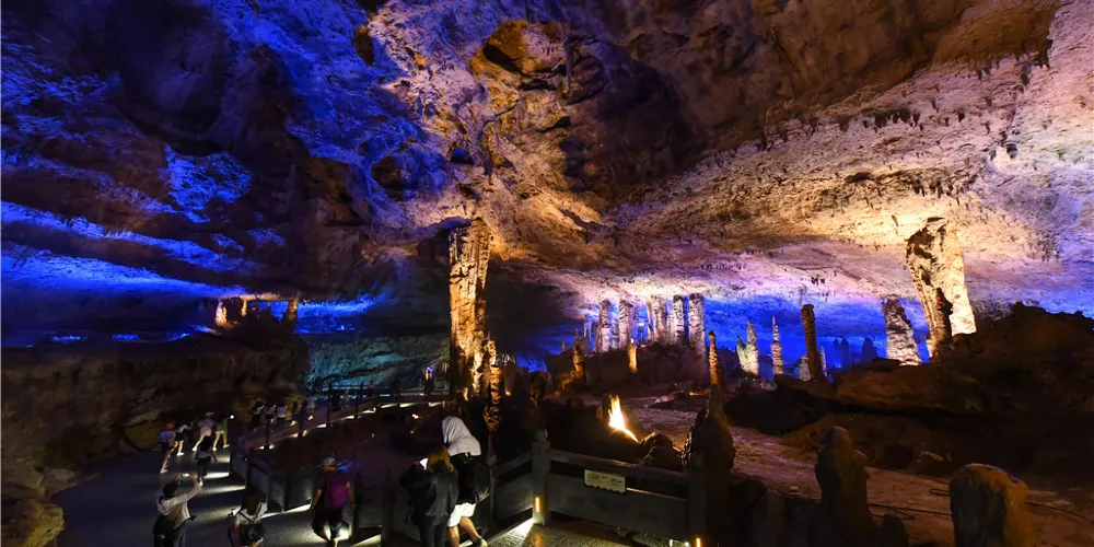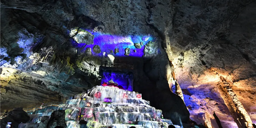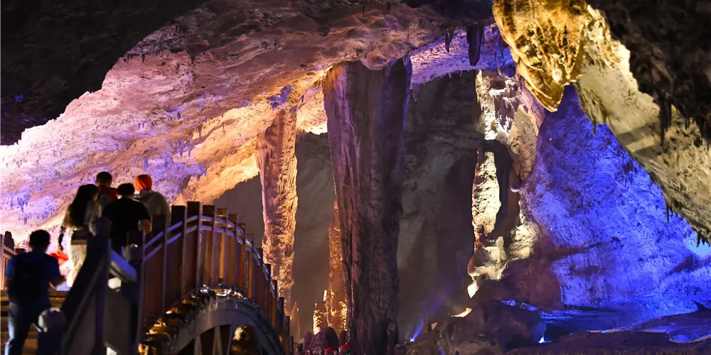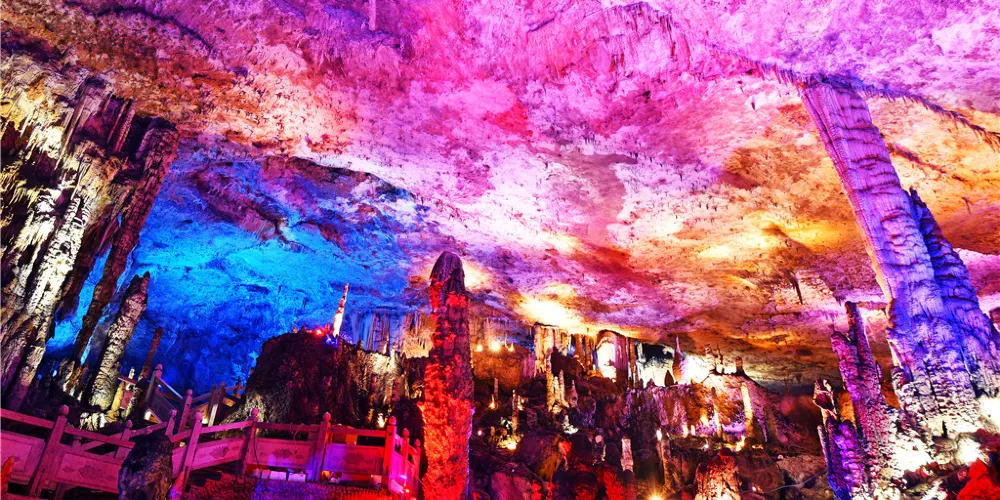 九天洞距市區70公里。九天洞百餘處景點、景觀堆珍疊玉,藏奇納秀,神祕莫測,幽深無堰,享有“世界奇穴之冠”、“亞洲第一大洞”諸桂冠。洞分上、中、下三層,最下層低於地表麪400多米。洞內36支洞交錯相連,內有30餘座大廳、10餘座洞中山、6方千丘田、5座自生橋、3段陰河、3個天然湖、12瀑、3井等景。洞中石林密佈,鍾乳懸浮,巖漿鑄成的各種精緻景物婀娜多姿。洞中的石筍、石柱、石幔、石花、石人、石獸等千姿百態,不可名狀,紛呈紅黃綠白黑灰諸色,可謂五彩繽紛,琳琅滿目。其中九星山玉柱、九天玄女宮和壽星宮三大奇觀堪稱景絕蓋世。