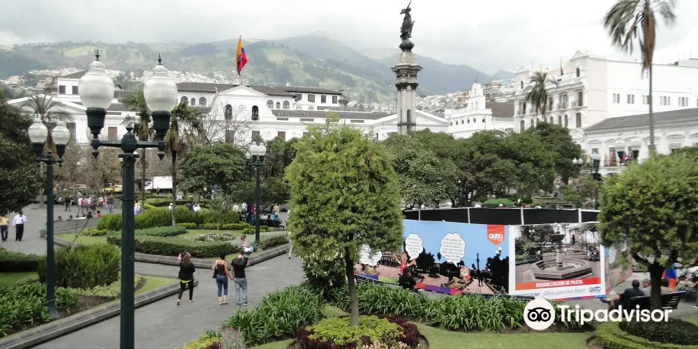 獨立廣場是基多市的中心地帶,在這座正方形廣場四周,聳立著一座座富有意大利文藝複興後期藝術特色的建築。這些建築大多為兩層,配有精雕細刻圖案的石門。廣場南端的天主教堂,始建於1550年,完工於18世紀,綠瓦圓頂,灰白色圓柱支撐門廊,是阿拉伯、波斯和摩爾人的建築風格的混合體。外牆上有用金葉鑲嵌的基多城奠基者姓名,院內有蘇克雷將軍的陵墓。教堂對面是大主宮,廣場西北角是雄偉壯觀的政府宮。