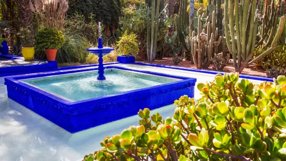 伊夫聖羅蘭花園原本叫Jardin Majorelle,曾是法國藝術家Jacques Majorelle親手建造的私人別墅,後又被法國時裝大師伊夫.聖.羅蘭買下並居住數載。現在開放成為馬拉喀什頗具人氣的景點,園內遍布珍奇植物,環繞著一座藍色的別墅,還有伊芙聖羅蘭的墓碑和一個小咖啡館。