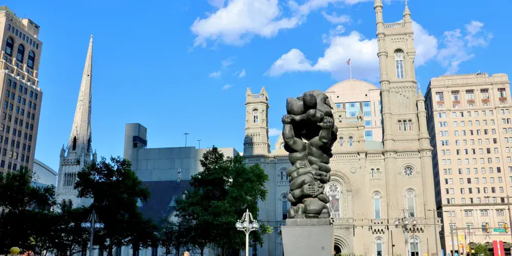 則評價費城市政廳由有名建築師John McArthur設計,建於1871年,為期30年,耗資二千四百萬美金。費城市政廳高達167米,1901年建成時為世界高樓,並保持了7年的記錄。費城市政廳的樓頂矗立著費城的開口者威廉•佩恩的銅像。起初費城規定任何建築的高度都不能高於銅像高度,後來由於發展的需要,不得不在銅像背面佩恩“看不見”的地方蓋起了高樓,因此如今這座建築的東側仍然擁有著古樸風貌,而西側則蓋起了鱗次櫛比的高樓大廈。