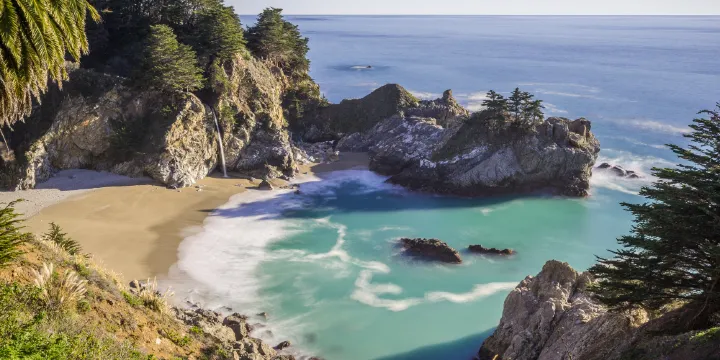 McWay瀑布位於朱莉婭·菲佛·伯恩斯州立公園內,是一座有着獨特風景的瀑布。大多數的瀑布出現在森林中,但McWay瀑布卻是直接注入大海,十分壯麗。瀑布旁有一條徒步線路直通海邊,你可以眺望遠處一望無際的大海和日出日落,色彩變化,令人心曠神怡。