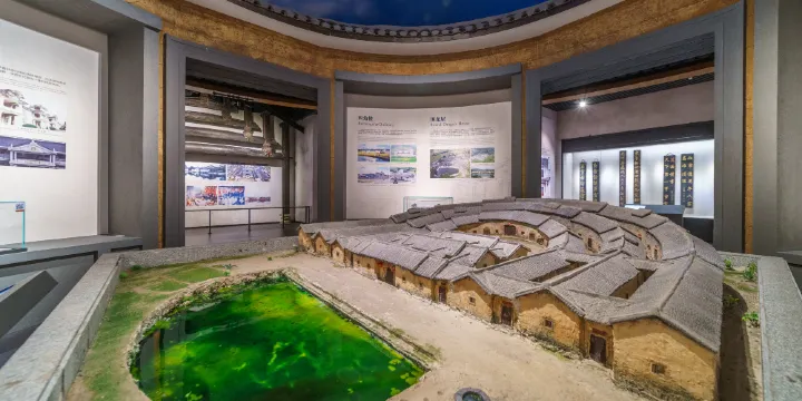 梅州市博物館的主館分“客從何來、客家風情、地標圍屋、人文秀區、客家騰飛”五大部分,陳列大量客家民居及民俗場景模型、客家服飾、民間實物、生產工具、生活用品、古典傢具、圖片資料等,再現了客家傳統民俗文化。