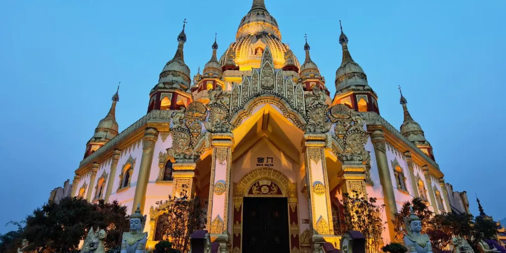 勐煥大金塔位於芒市東南部海拔上千米的雷崖讓山頂。該塔為八角四門空心佛塔,下面三層為空心大廳,屬南亞傣王宮的建築風格,有著深厚的民族文化內涵。青山綠水間的勐煥大金塔金光燦燦,雄偉高大,是芒市標誌性的建築,也是生活在這裡的傣族人民的聖地。