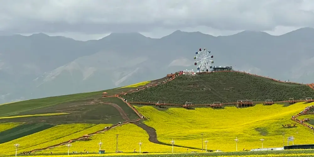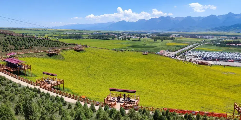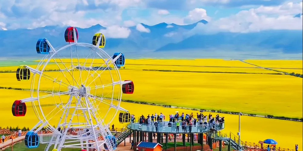 門源油菜花是指青海省海北藏族自治州的門源縣一種美麗而蔚為壯觀的人造景觀。門源縣是北方小油菜發源地,是小油菜種植區,種植面積達50萬畝。這裏油菜花的種植範圍西起浩門河畔的青石嘴,東到大通河畔的玉隆灘,北到與甘肅省交界的冷龍嶺,南至高峻的大阪山,綿延數十公里。觀景台位於油菜花海的中間地帶,有多個高低不同的觀景平台,由木棧道相連接,觀花台可遠眺百里油菜花景觀,頗為壯觀,在這裏可以俯瞰不同方位的花海,視野開闊,風景很好。
