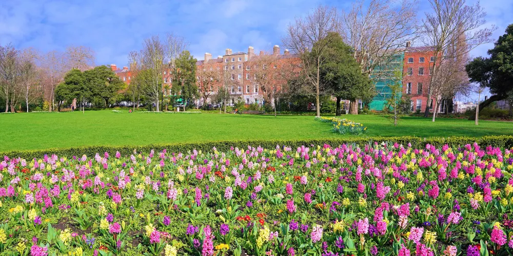 廣場建成於19世紀初,是都柏林保存較完好的廣場。綠草如茵,鮮花競放的公園三面環繞着喬治亞時期的紅磚房屋,自然歷史博物館和愛爾蘭國家美術館都散落在廣場的西側。直到1950年代,廣場上的大部分房屋為住宅所用,知名詩人葉芝就曾住在廣場的82號,愛爾蘭民族主義代表丹尼爾·奧康奈爾住在58號。所以在廣場看到許多住宅都掛有牌匾不要感到奇怪,上面可能就記載了前任知名住户的歷史故事呢。另外公園裡還有很多名人的銅像,其中較受遊客喜愛的莫過於王爾德斜靠在石頭上挑逗的那尊。