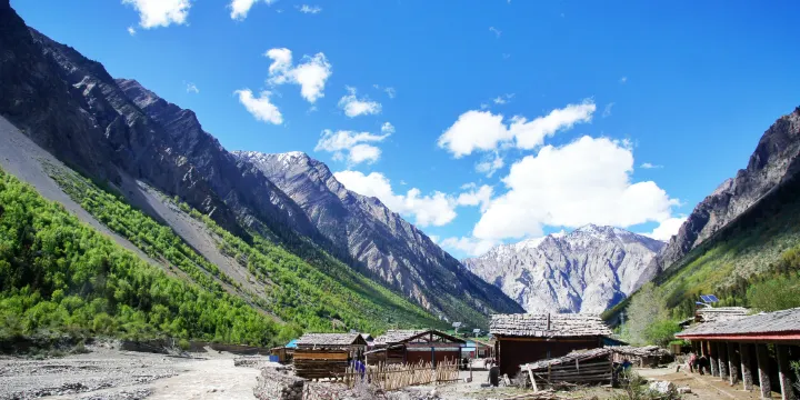 米堆村位於波密縣玉普鄉的米堆冰川腳下,距離米堆冰川僅有2公里左右,距離318國道也僅有幾公里,有一般的鄉村路,越野車等都可以進入。米堆村不大,是一個安靜的藏族小村,一座座藏式院落錯落有致,房屋一般是二層,每家都會有搭着青稞、小麥的曬台,院子裏的樹木、經幡等,很是漂亮。而且這裏海拔很低,大約衹有2000米,附近的樹木茂密,夏季時成片的作物分佈在山坡上,田園風光令人欣喜。村內目前有一些人家提供食宿,如果時間充裕不妨在這裏住住。