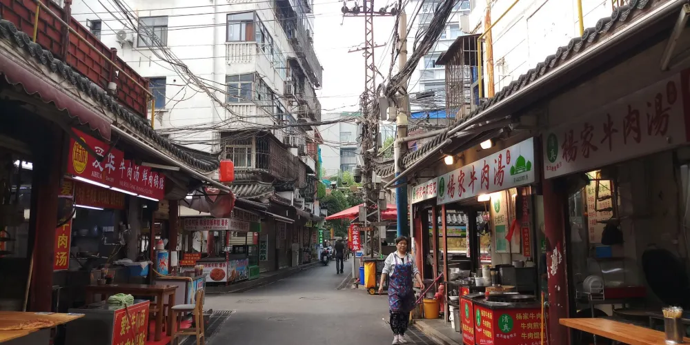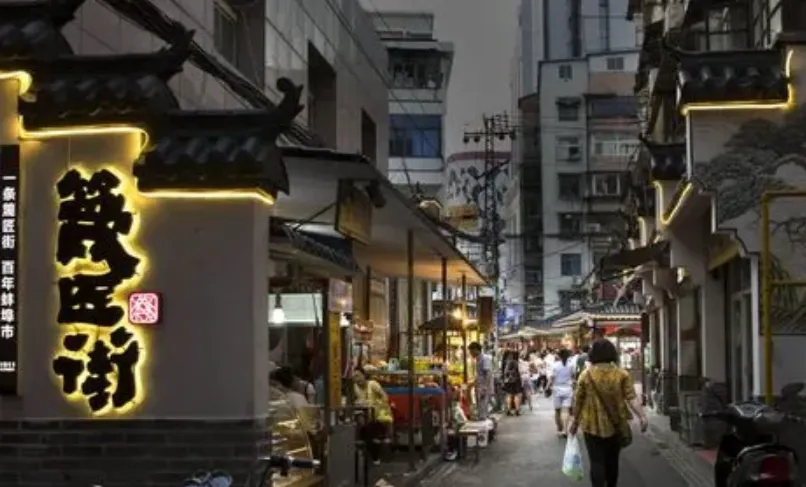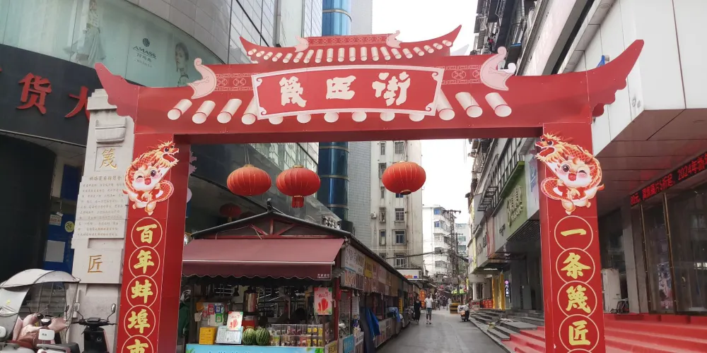 篾匠街(蚌埠百貨大樓店)位於安徽省蚌埠市,是一條徽派風格的仿古街區,街上店鋪林立,人潮攢動,熱鬧非凡。
