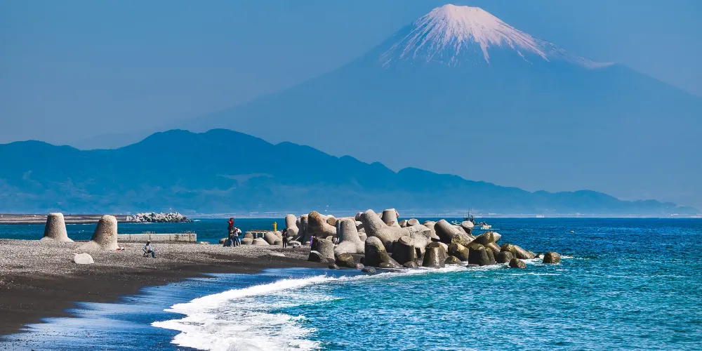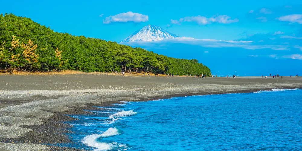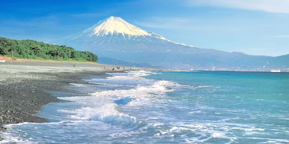 三保之松原是位於清水港至駿河灣的突出的半島,在很久以前的平安時代,就是有名的景勝地。在三保之松原7公里長的海岸線上生長了5萬4000株松樹,是3代松原之一。仰望靈峰富士山,綠色的松林,白色的浪波,藍色的大海構成了一幅美麗的風景畫。特別是波浪打擊海岸的時候,觀賞富士山更加的巍峨。三保之松原在大正5年被選為日本新三景的名勝地之一。