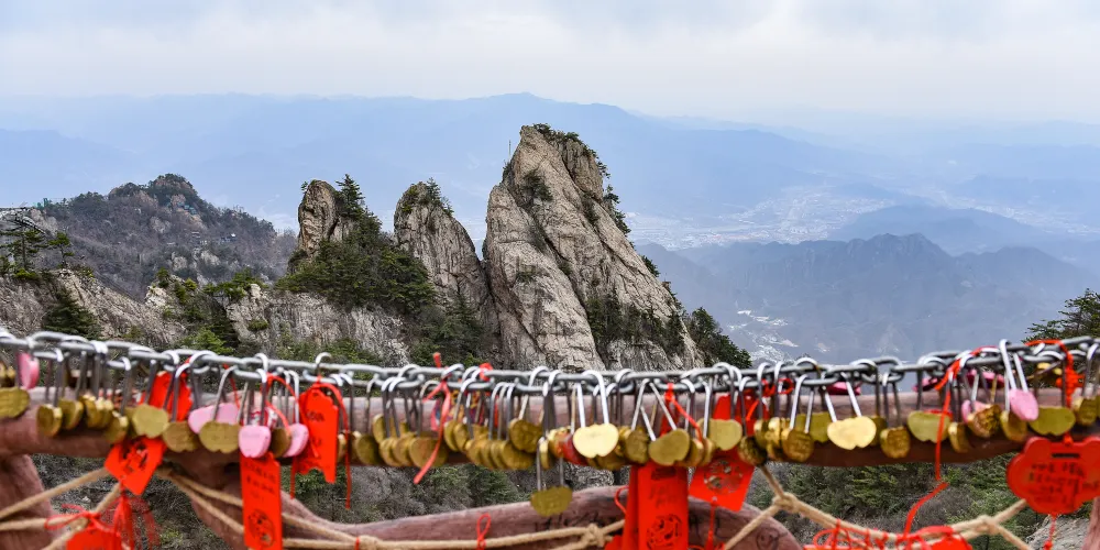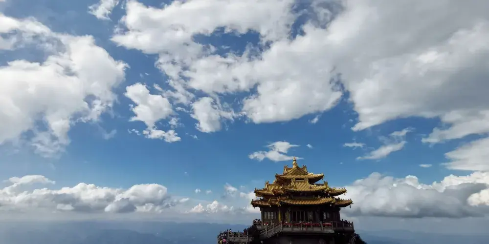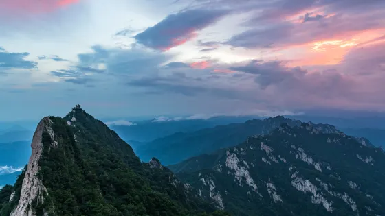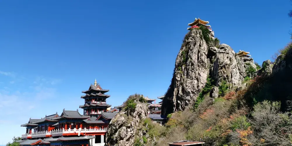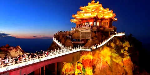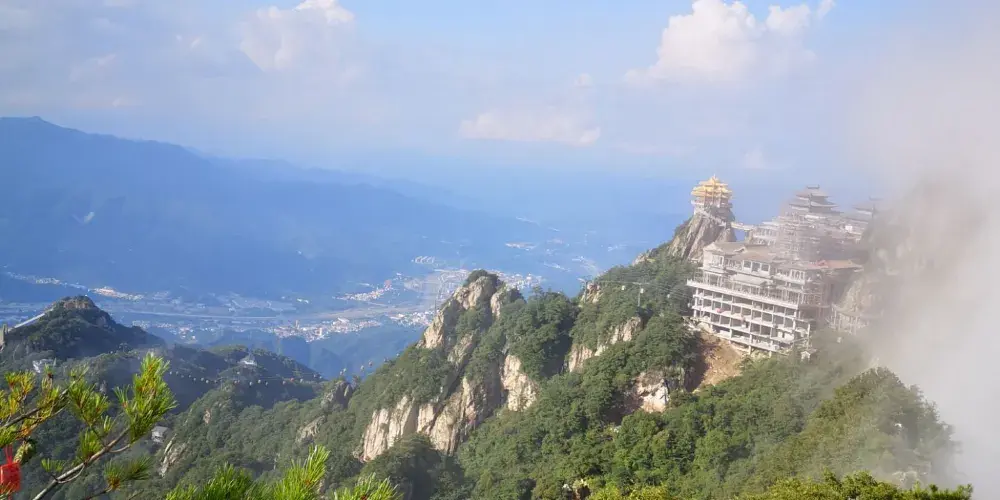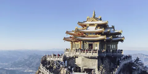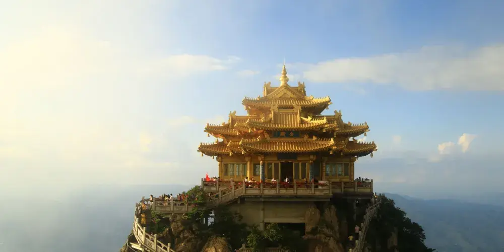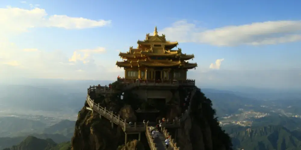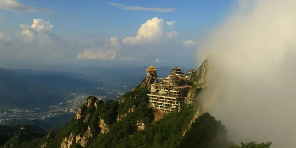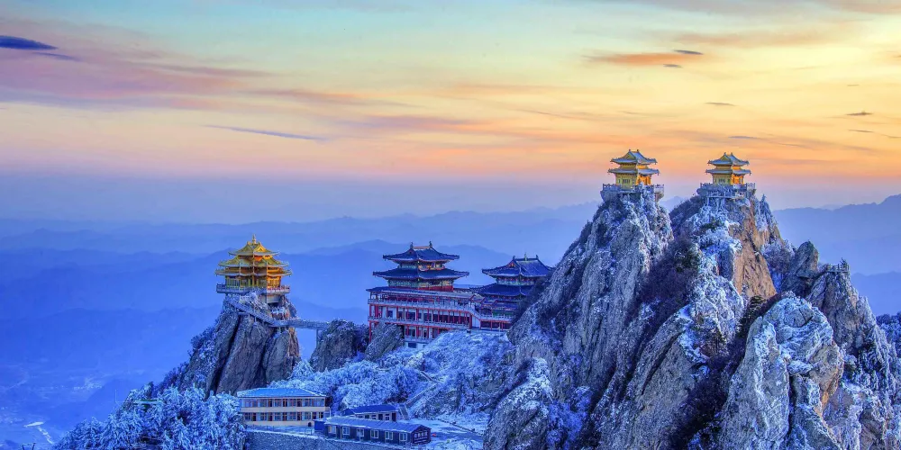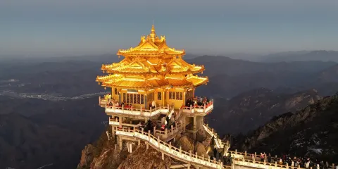老君山金頂道觀群位於洛陽市欒川縣老君山景區內,處在高聳的羣峯之巔。道觀羣在陽光的照射下,折射出耀眼的金光,如夢如幻,恍若仙境。