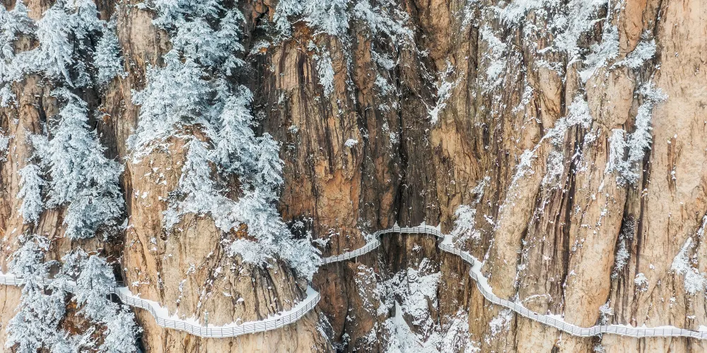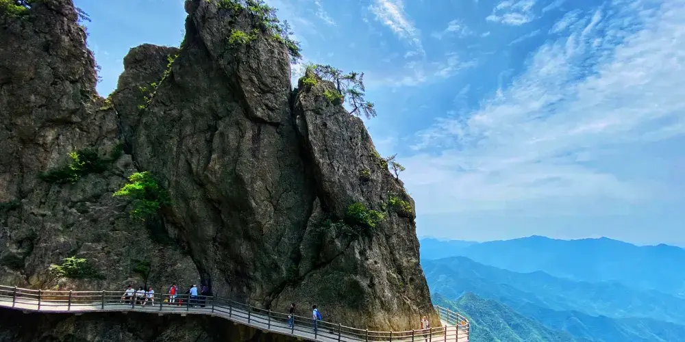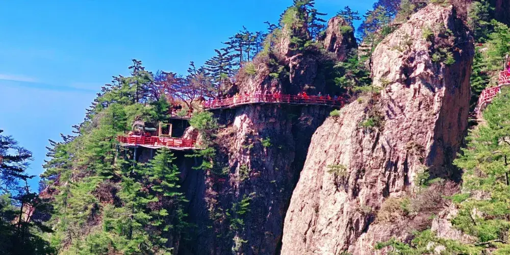 老君山內綿延十裡的穿雲棧道都是如畫的美景,從而被稱為十裡畫屏。放眼望去整個山上披綠掛紅,雄偉壯觀,遊走中間,一步一景,景景如畫,讓人如癡如醉。
