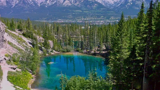 GrassiLake在Canmore市,Banff以東20多公里。湖泊清澈碧綠,被山川環保,湖面平靜。湖邊長滿了鬱鬱葱葱的樹木,還有小木椅子可供遊人休息。
