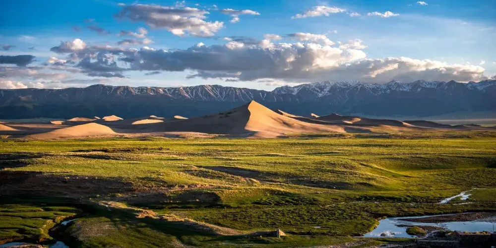 鳴沙山位於哈密地區巴里坤哈薩克自治縣境內。鳴沙山的來源是因為在遼闊的草原上有一座以石英長石堆積而成的沙山,山腳下有條小河,當人們從沙山頂往下滑時能聽到從山的內部發出的聲音,那聲音就像萬馬奔騰一樣,所以叫它鳴沙山。它的周邊是草場,可以看到有牛羊在吃草,還可以看到遠處的雪山。有滑沙,水上游玩項目,還可以騎馬。